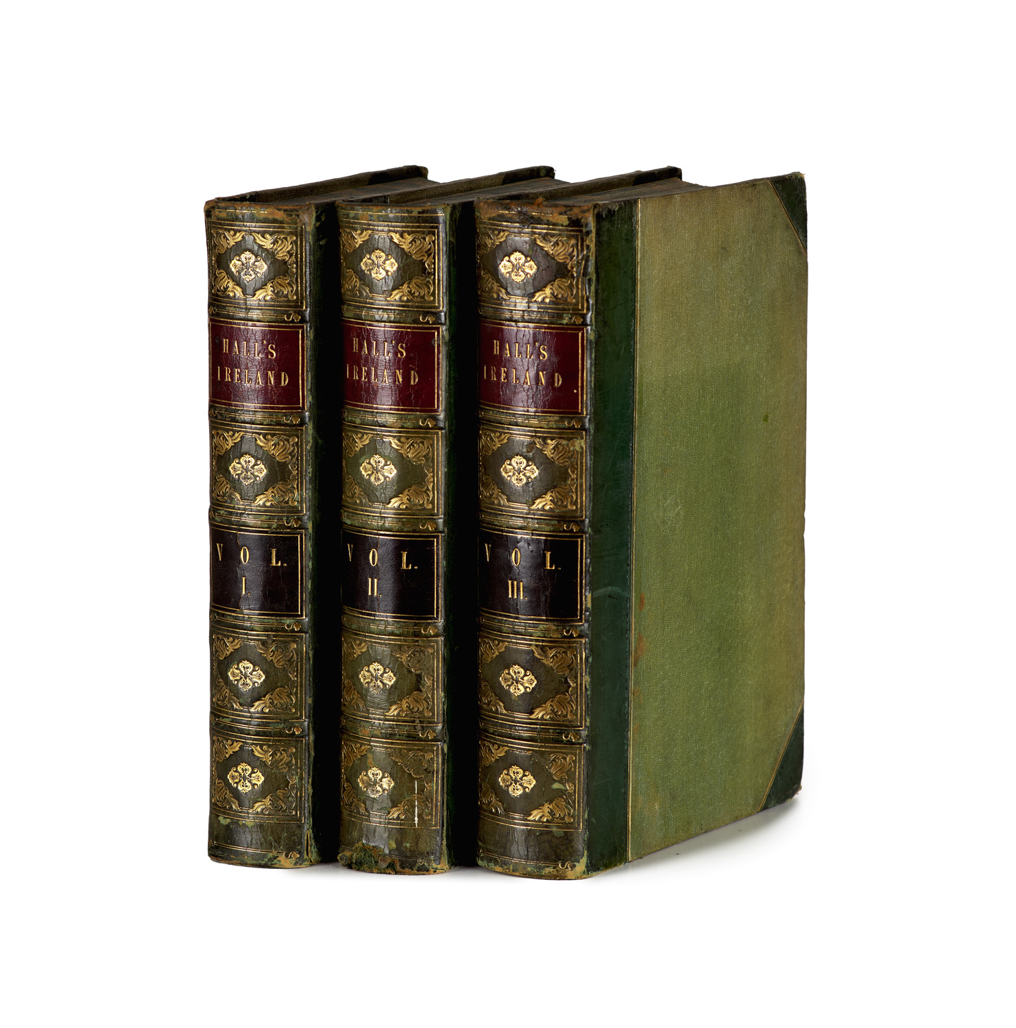Ireland: Its Scenery, Character, &c. A new edition. 3 Bände. Mit 18 kolorierten Karten, je zusätzlichen, illustrierten Titeln und rund 100 Tafeln im Stahlstich, sowie rund 500, teils ganzseitigen und oft großen Textholzschnitten. London, Hall und Virtue. 1 Bl. (gedr. Tit.), XII, 436 S. 2 Bl. (flieg. Vors., gedr. Tit.), VIII, 468 S. 2 Bl. (flieg. Vors., gedr. Tit.), VIII, 512 S. 4°. Hldr. d. Zt. über 5 Bünden mit reicher Goldprägung bestehend aus Deckelfileten und floraler Ornamentik sowie Titel auf Rücken, Vorsätzen aus Steinmarmorpapier und umseitig marmoriertem Schnitt (an den Kapitale stärker bestoßen, an den Ecken und Kanten beschabt und berieben.)