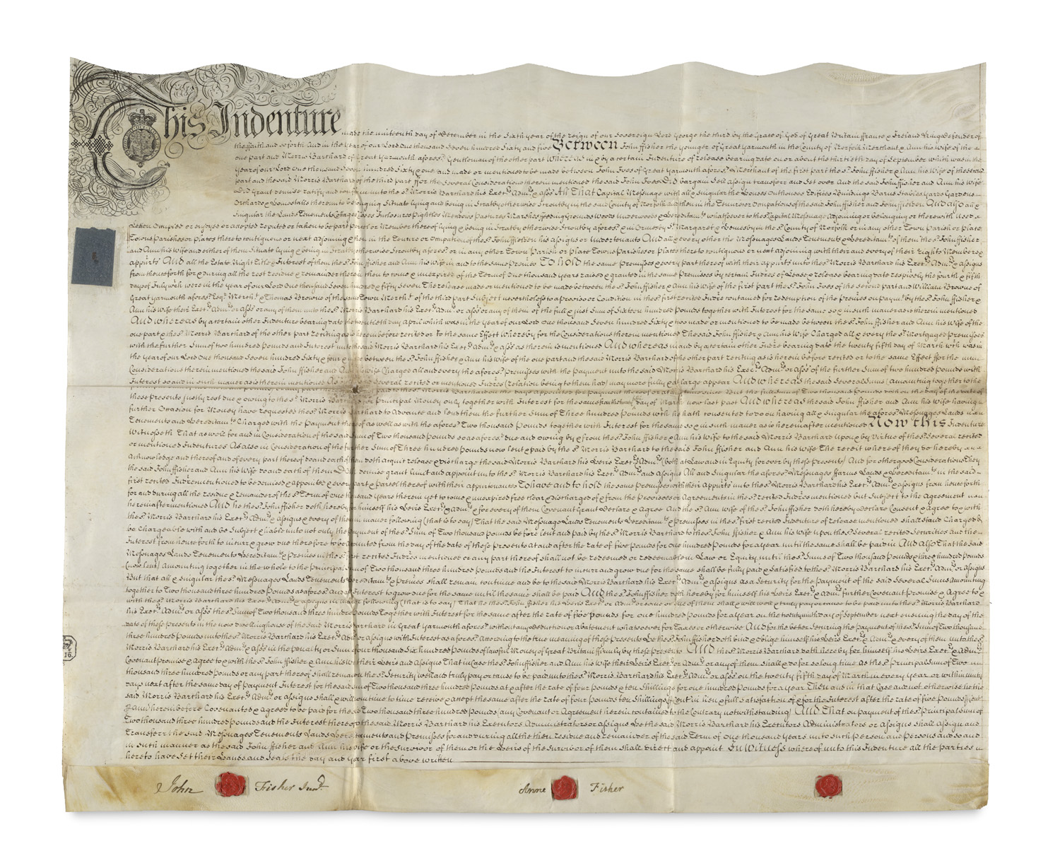 Manuscripts – Indenture. English document manuscript in black ink on roughened parchment, with decorated incipit supplemented by coat of arms, 6 (three repeated) signatures, 3 figurative wax seals and 3 value stamps (2 of which are glued and 1 stamped). Great Yarmouth, Norfolk, 19 December 1765. Approx. 62.5 x 78 cm. Folded. - Contract between John Fisher and his wife Anne Fisher on the one hand and Morris Barthard on the other. - With two signatures each from the Fishers and a notary. - Verso marked 'Further Security for 300 Pounds'. - Somewhat stained and dusty, overall a complete document in good condition.