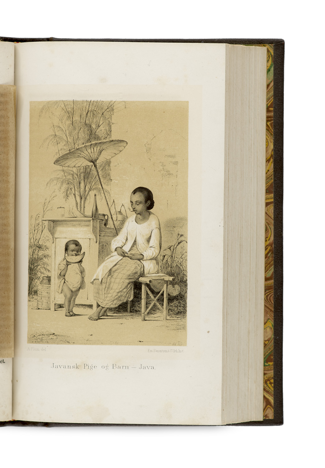 Geographie und Reisen – Erste Ausgabe. - Sabin 5399 - Vgl. Dinse 231 (dt. Ausgabe 1852) - Ausführliche Darstellung der Weltumseglung der dänischen Korvette Galathea. - Die Tafeln zeigen vor allem Einwohner der verschiedenen Kontinente, darunter sogar "ridende Fruentimmer" auf Honolulu. - Durchweg stockfleckig. Insgesamt gut erhalten.Dabei: Steen Bille's Bericht über die Reise der Corvette Galathea um die Welt in den Jahren 1845, 46 und 47. 2 Bde. Mit insgesamt 2 Karten und 14 lithographischen Tafeln. Kopenhagen, Reitzel, 1852. 8°. Pp. mit mont. RSchild. - Insgesamt sehr gut erhalten.