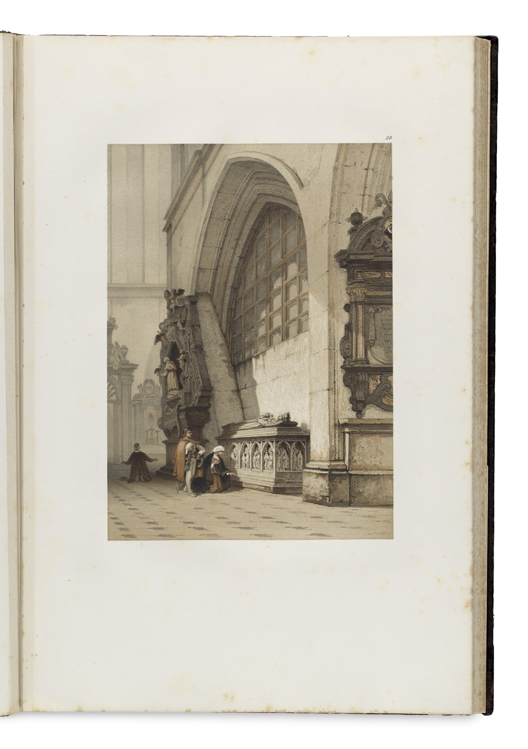 Geography and Travel – Poland. - With 30 color lithographed plates. "Avant la lettre" copy of exceptional rarity - since 1950 only one copy has been recorded in the KVK, and none traced on the international market. - Bobins 1704. - KBR, Brussels II 12.025 D et E (LP). - Catalogue of Valuable Printed Books, Sotheby's, April 26, 1937, Lot 147 (referring to the avant la lettre edition: one of 25 copies). - Thieme-Becker XXXII, p. 206. A splendid artistic and illustrative journey through Galicia, with a particular focus on architectural monuments, city views, and picturesque landscapes. It belongs to the series of so-called "monumental and picturesque" representations in which Stroobant depicted various European regions in lithographic scenes. Usually comprising several dozen lithographic plates based on Stroobant's own drawings, printed either in color or in sepia tones. They depict churches, castles, cities such as Lemberg (Lwów/Lviv), Kraków, Przemysl, and Tarnów, as well as landscapes of the Carpathians and river valleys. The magnificent large-format plates (image size 33 × 22 cm) devoted to Kraków show, in equally refined and vividly fresh coloration, views of St. Mary's Church and the Princes' Tombs (8), the Franciscan Monastery, the Dominican Church, the Government Palace and Town Hall, the University (2), the Treasury, the Cloth Hall, the Florian Gate, and several city streets. The artist's mastery is particularly evident in his treatment of light and shadow. Animated with staffage figures and small scenes, his views exude an impressive atmosphere. He captures the changing moods of the day with remarkable sensitivity: the delicate morning light filtering through Kraków's winding alleys, the blazing midday sun over Wawel Hill, the reddish evening glow streaming through the lancet windows of St. Mary's - and the quiet nocturnal scene of three monks in white robes conversing by a column stump in the moonlit ruins of the Dominican Church. La Galicie monumentale et pittoresque is today a rare and historically valuable work, documenting many buildings and cityscapes later destroyed or altered during the 20th century. It unites the documentary spirit of the 19th century with a romantic and aesthetic view of landscape and architecture - typical of Stroobant's art. Early issue, printed before the addition of all lettering, without title page and plate list. Splendid, nuanced impressions, some with painterly qualities, printed on strong paper. Occasional small brown spots in the outer margins. Overall, a very good copy of this rare publication.