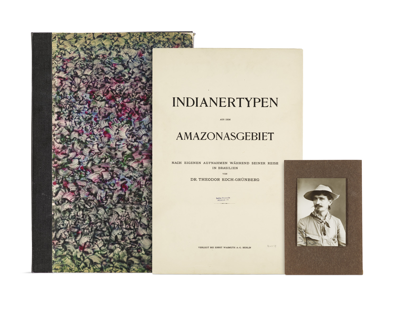 Indianertypen aus dem Amazonasgebiet. Nach eigenen Aufnahmen während seiner Reise in Brasilien. 141 im Druck nummerierte und betitelte Tafeln in Heliogravüre mit zumeist je 4 und vereinzelt mit 2 oder 3 Abbildungen nach Originalphotographien des Verfassers, sowie 1 farblithographischen Karte, 1 Titelblatt und 7 gefalteten Druckbogen mit Textblättern zu den ebenso vielen Lieferungen. Berlin. Wasmuth (1906-11). Folio (48,4 x 32 cm). Spätere Hln.-Kassette mit drei Klappen und zwei Schließenbändern, bezogen mit mehrfarbigem, teils geätztem Kleisterpapier in Muschelmarmormanier (etwas berieben und bestoßen, die Decken mit kaum merklichem Lichtrand). Beigegeben: Photoporträt von Theodor Koch-Grünberg, signiert, datiert und veortet "Th. Koch- Grünberg, Manáus-Brazil. März 1913". 145 x 104 mm. Silbergelatinabzug, partiell montiert auf braunem Karton mit Fasereinschlüssen.