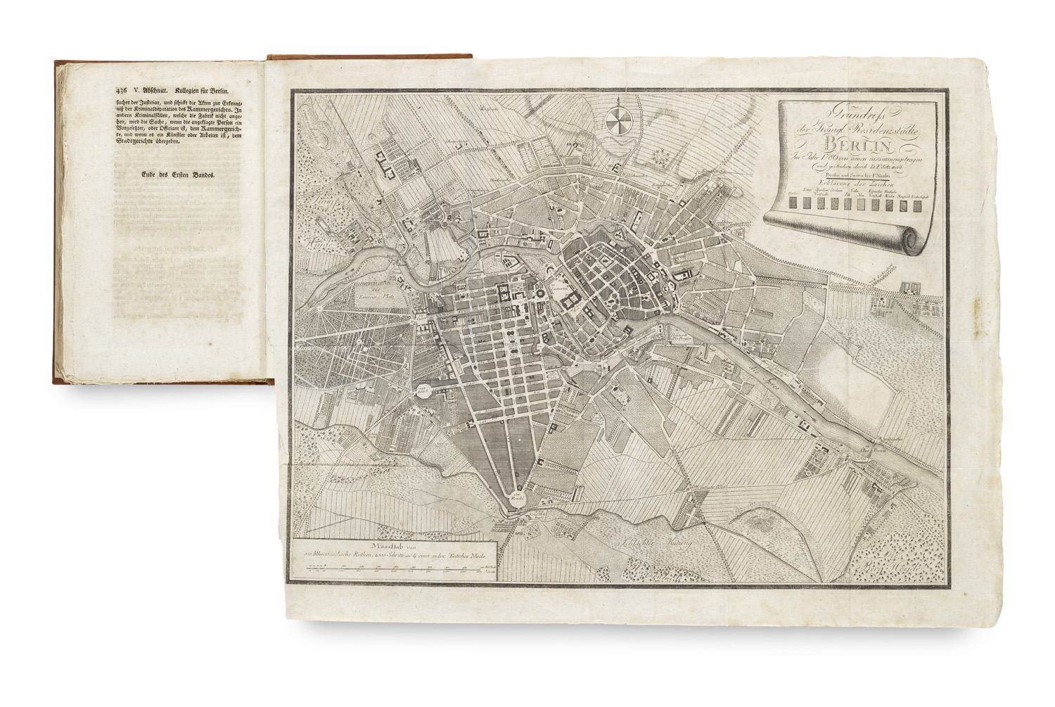 Beschreibung der Königlichen Residenzstädte Berlin und Potsdam, aller daselbst befindlicher Merkwürdigkeiten und der umliegenden Gegend. Dritte völlig umgearbeitete Auflage. 3 Teile und der Anhang in 4 Bänden. Mit zusammen 5 mehrfach gefalteten, gestochenen Grundrissen und Plänen. Berlin, Selbstverlag, 1786. 8°. Mod. HLdr. mit goldgepr. RSchild (leicht bestoßen).