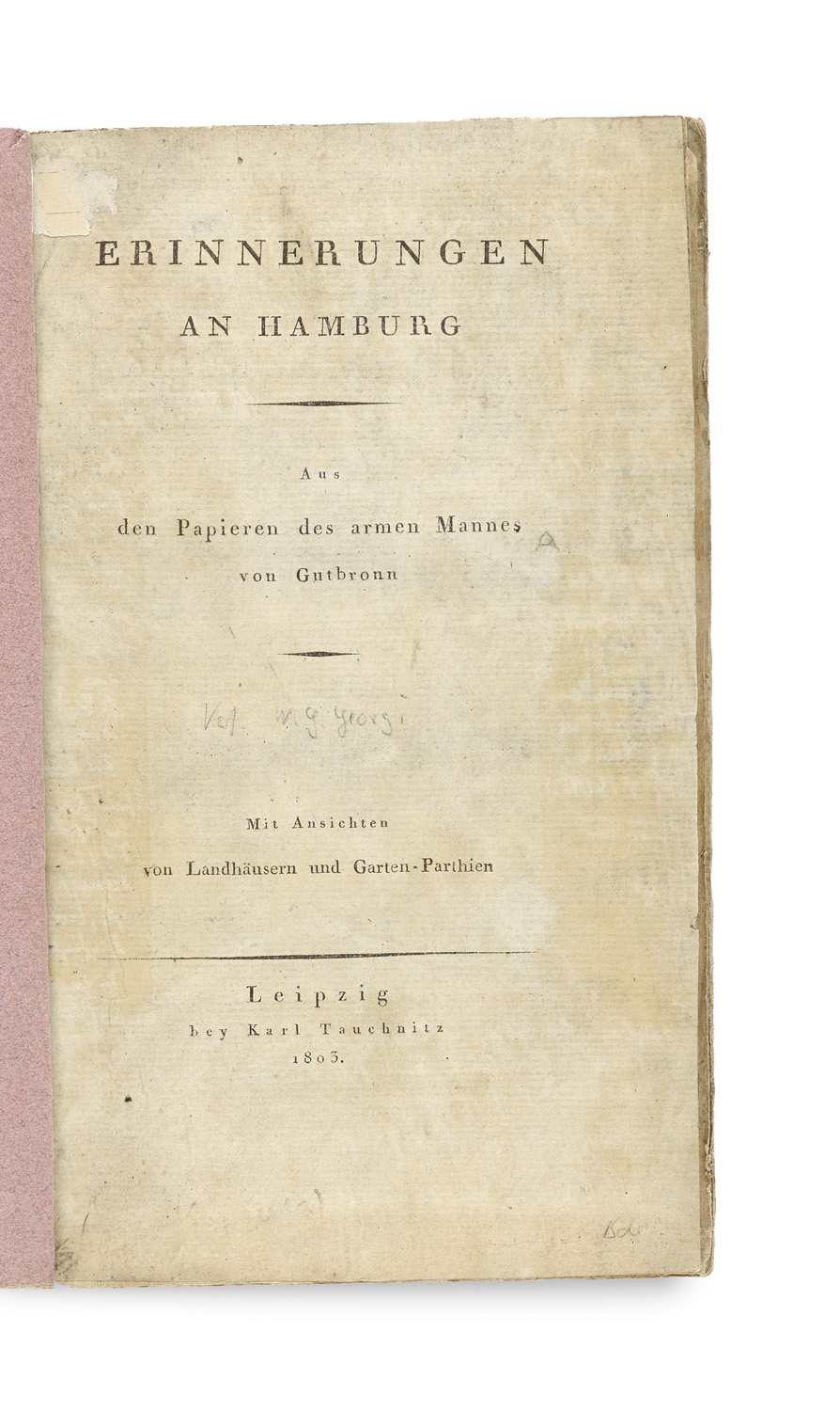 Erinnerungen an Hamburg. Aus den Papieren des armen Mannes von Gutbronn. Mit 5, wovon 4 gefalteten, zusätzlich radierten Kupferstichen. Leipzig, Tauchnitz, 1803. 2 Bl. (Tit. Vorw., Zwischentit.), 132 S. 8°. Interimsbr. d. Zt. (Rücken und Aussenränder gering beschädigt).