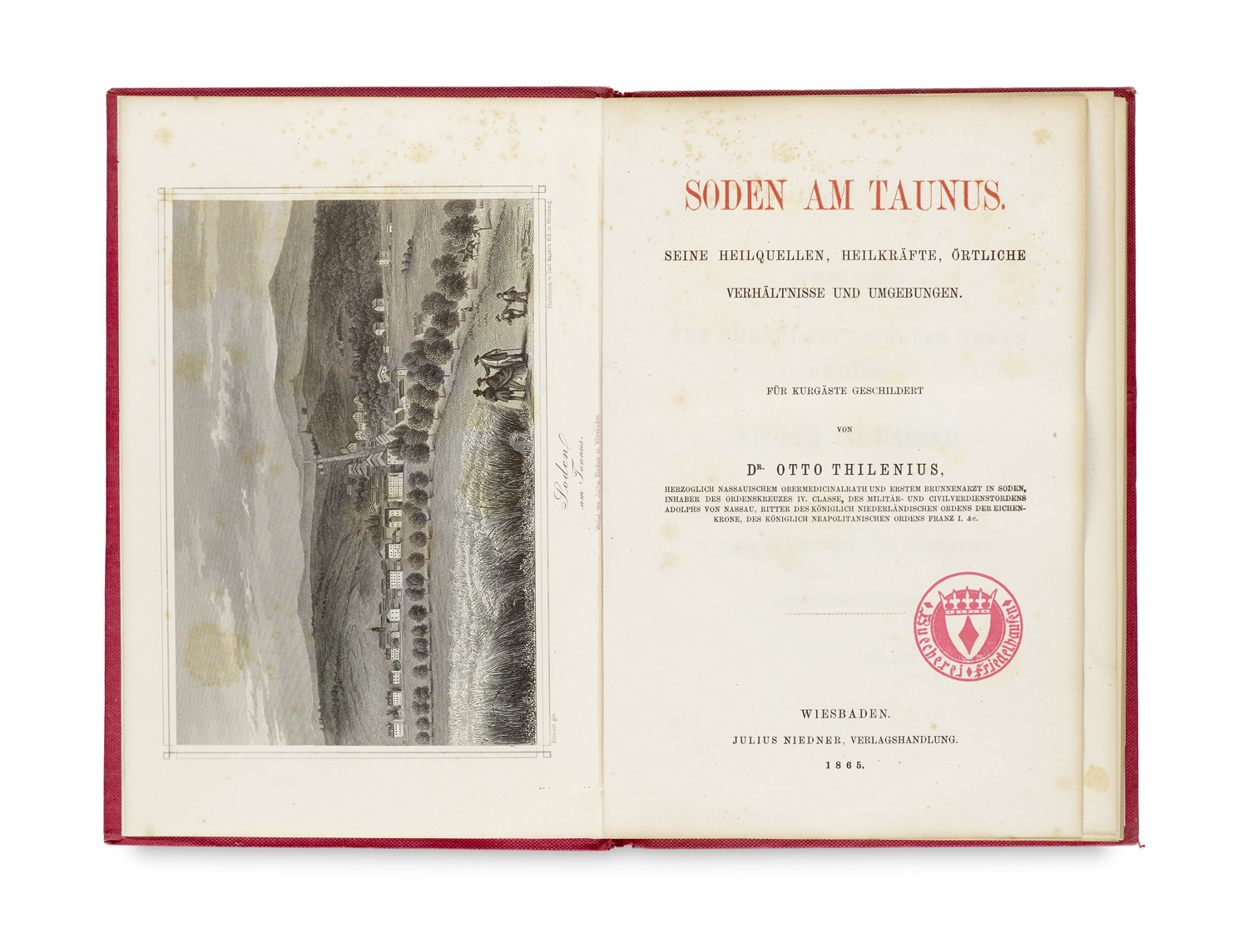 Soden am Taunus. Seine Heilquellen, Heilkräfte, örtliche Verhältnisse und Umgebungen. Mit 4 gestochenen Ansichten, einer gefalt. Tabelle sowie einer gefalteten grenzkolorierten Karte. Wiesbaden, Julius Niedner, 1865. 2 Bll., 130 S. 8°. Rote OLwd. mit goldgepr. DTitel (berieben und bestoßen, hinteres Gelenk angebrochen).