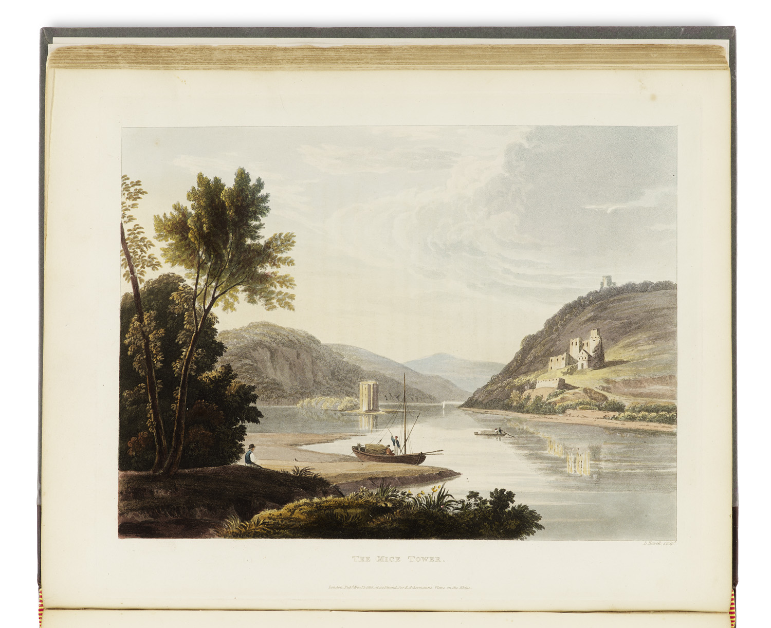 A picturesque tour along the Rhine from Mentz to Cologne: with illustrations of the scenes of remarkable events. Mit 24 kolor. Aquatinta-Tafeln von Havell, Sutherland u.a. nach C.G. Schütz u. 1 gefalt. Karte. London, R. Ackermann, 1820. XIV S., 1 Bl., 178 S. Gr.-4°. Ldr. goldgepr. RSchild (bestoßen).