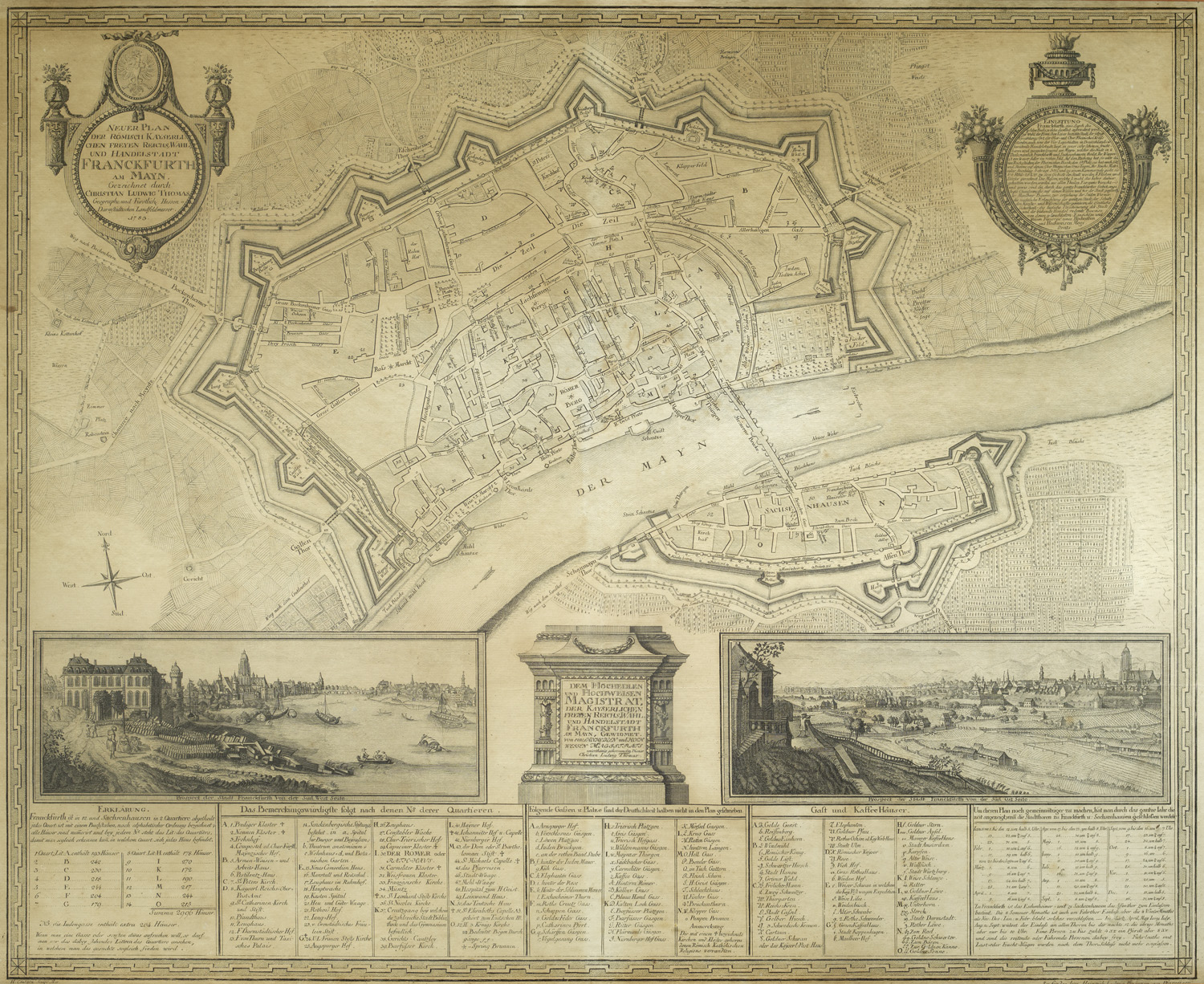Dekorative Graphik - Ansichten – Zweiter Zustand. - Bernhard Müller, Bilderatlas zur Geschichte der Stadt Frankfurt am Main, 1916, Abb. 19 - Sammlung Cornill 467. - Stadtplan von Frankfurt am Main mit Umgebung sowie zwei Ansichten unten rechts und links, zwei Titelkartuschen und einer Liste mit Erklärungen am unteren Bildrand. - Datiert 1783, in dem der Zeichner C. L. Thomas das Frankfurter Bürgerrecht erhielt. - Stockfleckig. Blatt leicht gebräunt. Insgesamt gut erhalten.