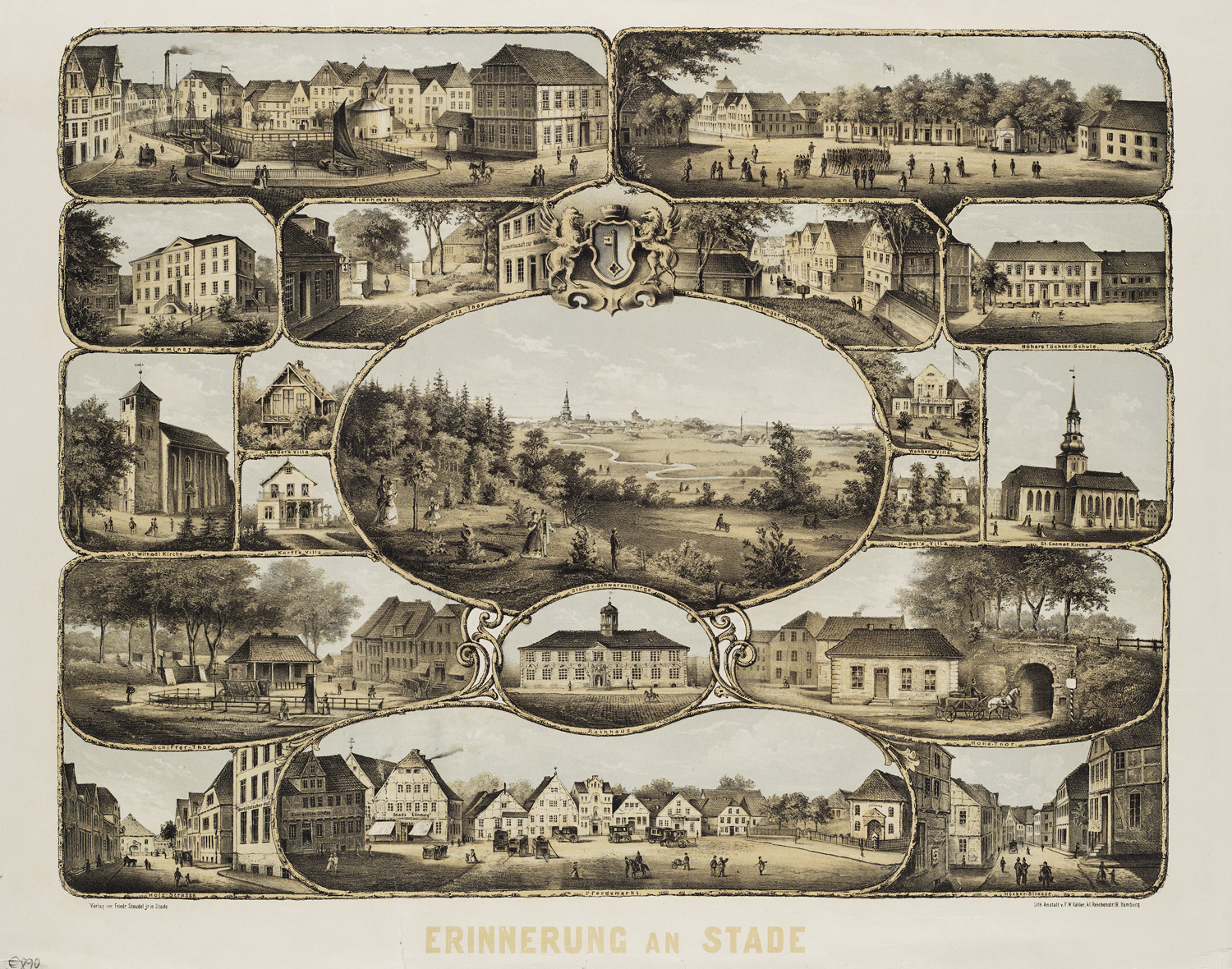Erinnerung an Stade. Chromolithographie. Stade, Friedrich Steudel, um 1860. 50 x 64 cm. Unterhalb des Motivs mit typogr. Angaben zu Verleger und Drucker sowie betitelt.