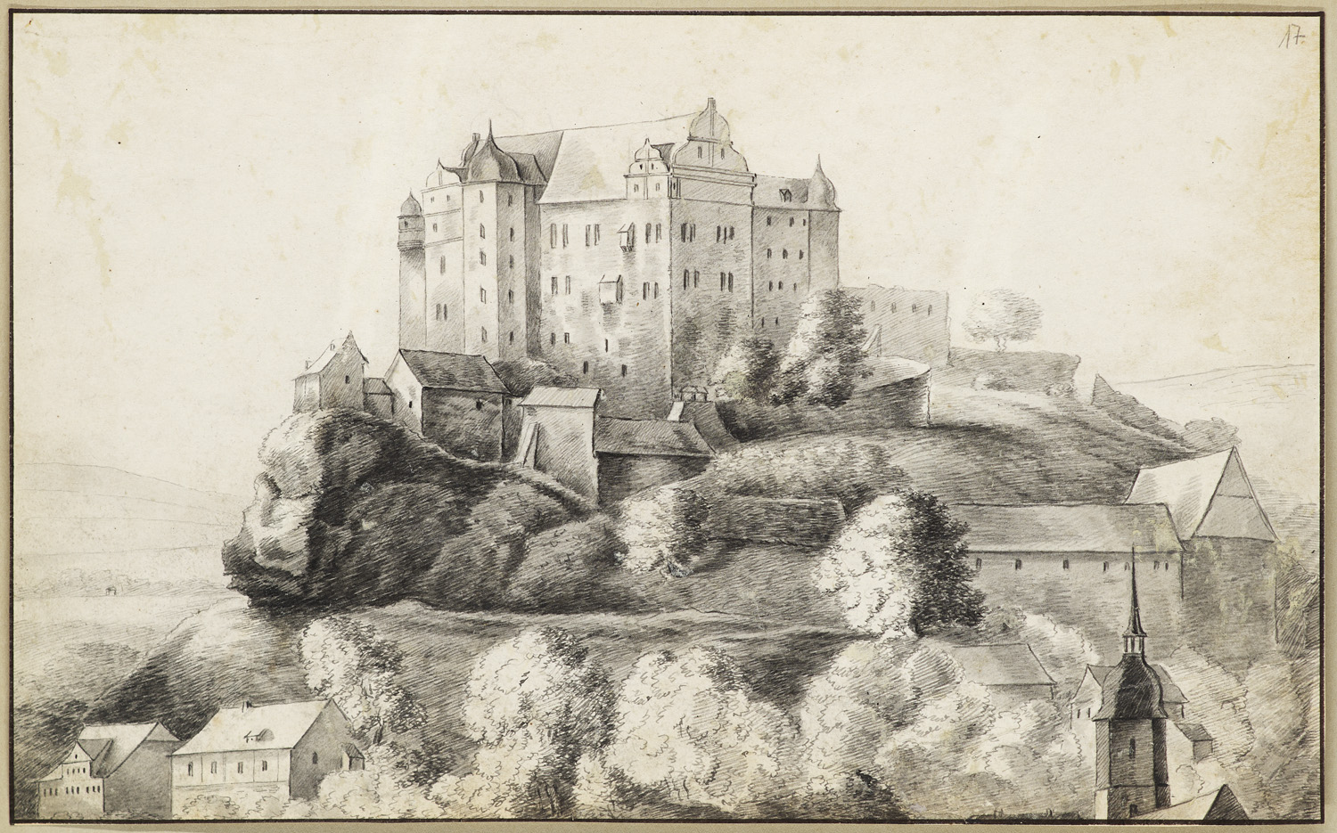 Prints and Engravings - Views – Collection of 14 drawings with views of Thuringia and Saxony. Each pen and ink drawing, partly washed. Partly inscribed, mostly with later handwritten inscription in pencil on verso. Occasionally mounted on backing. - Various views of small towns, castles, and palaces, including Obernitz/Saale, Schwarzenberg Palace, Burgk Palace near Freital, and Ranis Castle. - Somewhat browned, partially stained, and with minor foxing. Overall, well-preserved and comprehensive collection of original drawings.