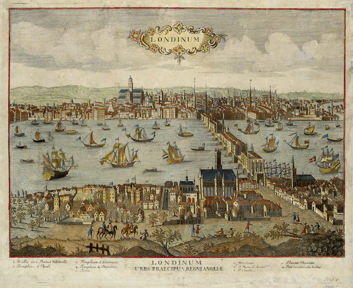 Dekorative Graphik - Ansichten – Kolorierte Ansicht von London vor dem großen Feuer im Jahr 1666. Mit Blick über die Themse und die London Bridge, nummerierte Erklärungen unterhalb des Bildrandes. - Restauriert. Fleckig. Insgesamt gut erhalten mit schönem Kolorit.