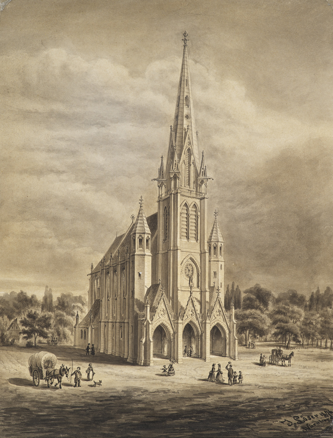 Dekorative Graphik - Ansichten – Fein ausgearbeitete Zeichnung der Pfarrkirche von Fröschweiler im Elsass. Ein Vorgängerbau wurde bei der Schlacht von Wörth zerstört, der hier dargestellte Neubau an selber Stelle erhielt bei seiner Einweihung am 30. Juli 1876 den Titel Friedenskirche. - Das Motiv der Zeichnung fand in Folge als Holzstich des Nürnberger Künstlers und Kupferstechers Johann Karl Lösers weitere Verbreitung. - Im Motiv mittig mit kl. u. unscheinbaren Löchlein, im Blattrand mit Spuren vorheriger Montierung bzw. Rahmung, rechts mittig mit kurzem Einriss, die Ecken etw. bestoßen. Insgesamt wohlerhaltene, detailliert ausgeführte sowie fein illuminierte Orig.-Zeichnung.