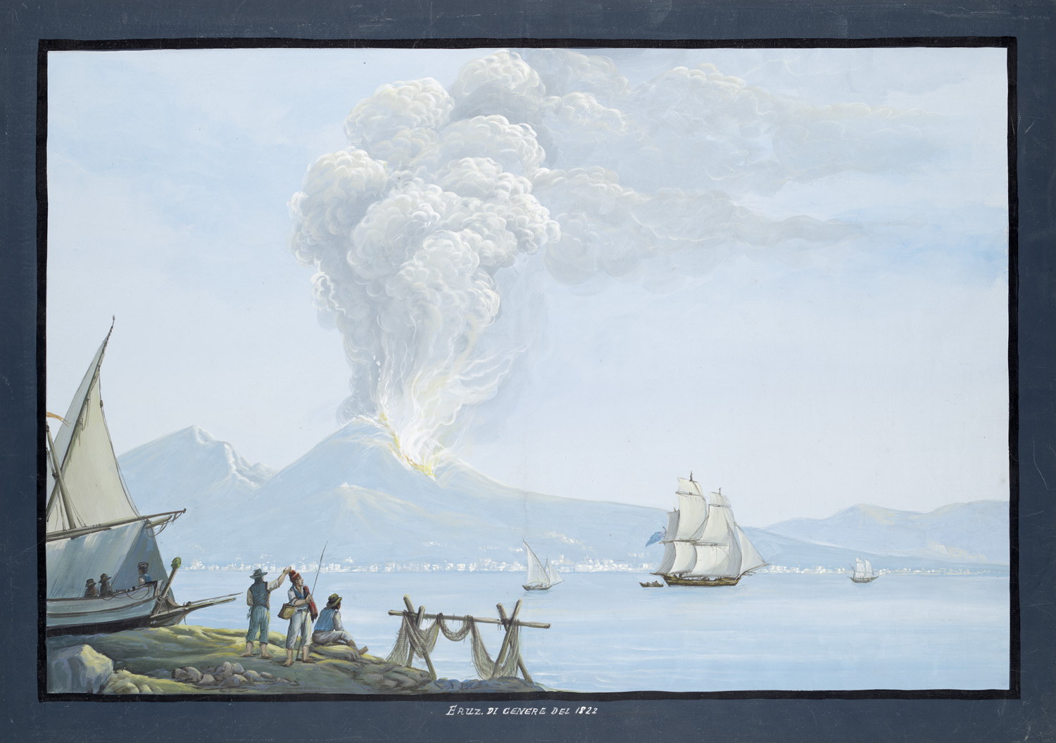 Dekorative Graphik - Ansichten – Selten. - Blick vom Ufer zum Ausbruch des Vesuvs mit hübscher Schiffsstaffage im Vordergund. Links am Bildrand sitzen Schiffer, die den Ausbruch des Vulkans von Weitem beobachten. - Ränder grau getuscht. Sehr gut erhaltene Gouache mit makellosem, deckenden Kolorit.
