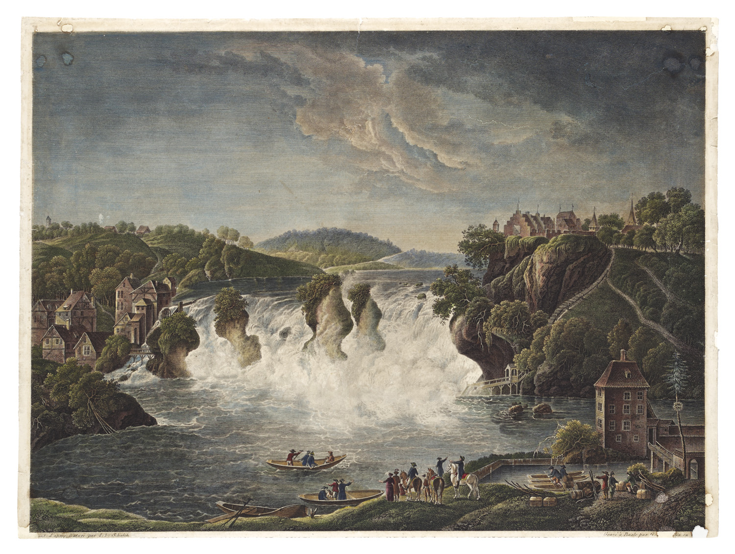Prints and Engravings - Views – Coloured copperplate engraving with a view of the Rhine Falls at Lauffen near Schaffhausen in Switzerland. Below the motig with engraved details on the engraver and publisher. - Engraved by Johann Jakob Schalch. - Margins somewhat stronger trimmed, paper browned, partially brown-stained, with small restored defects in few spots, occasional small replacements to the motif, small loss to the lower left margin (motif only minimally affected). Overall in good condition.