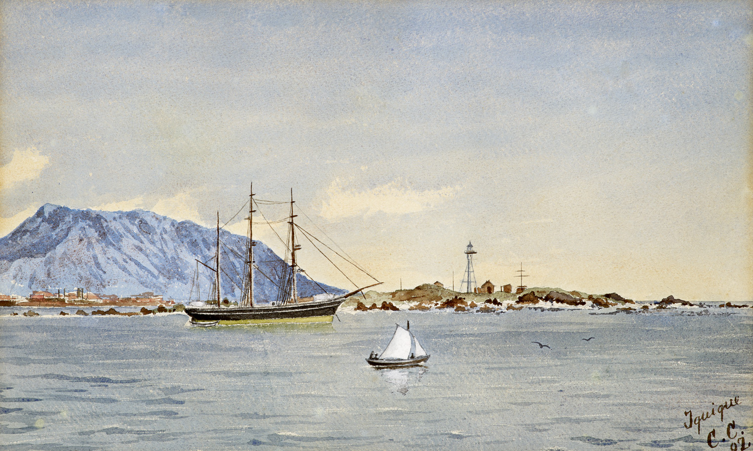 Prints and Engravings - Views – Watercolor painting with a view of Iquique, Chile. Watercolor on wove paper. Mounted under passe-partout, signed and dated. - Watercolor depicting a view of the city of Iquique in northern Chile, with an offshore island with a lighthouse on the right and a three-masted ship in the water on the left. - Overall, the watercolor is in good condition.