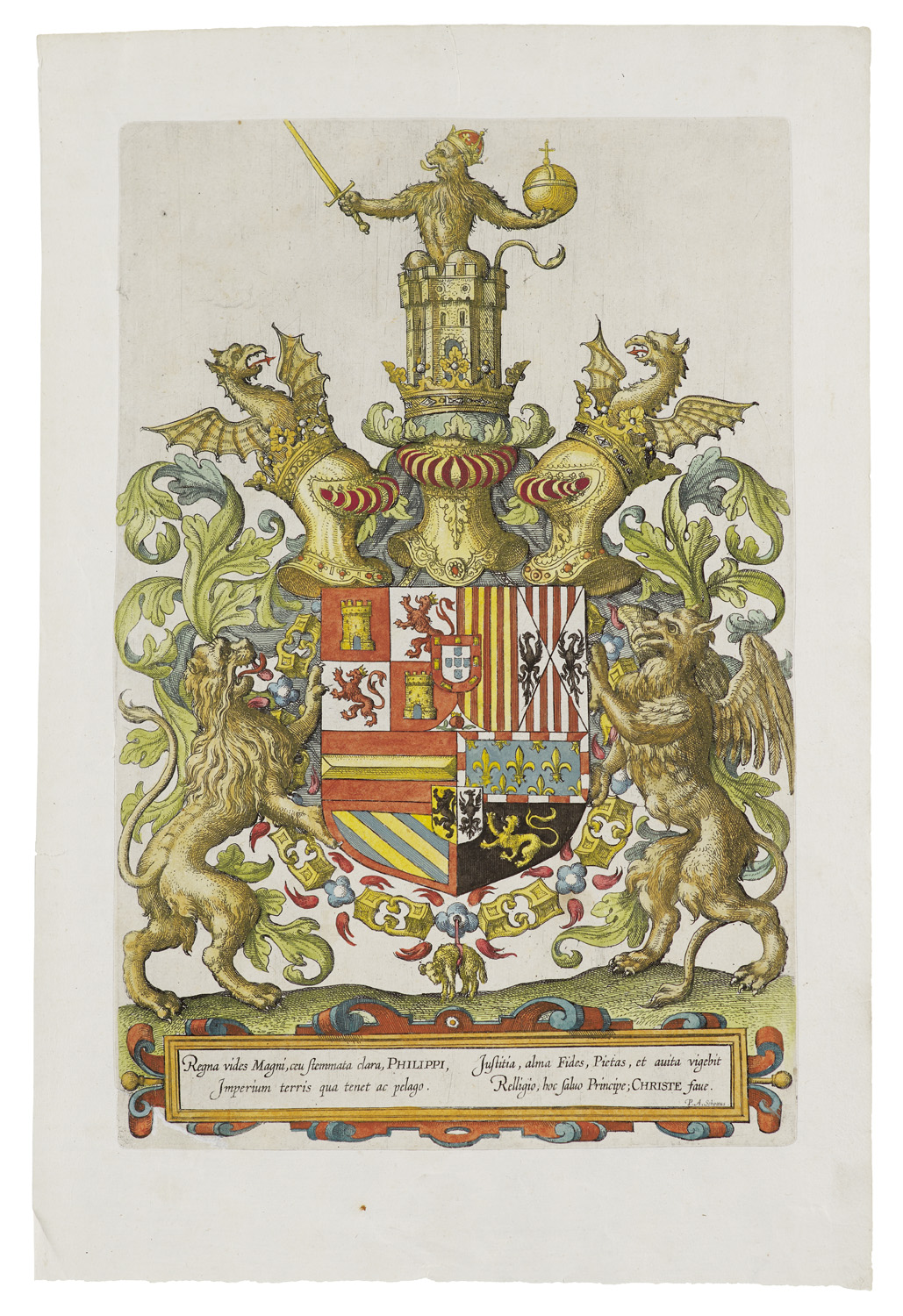Dekorative Graphik - Karten – Der flämische Kartograph Abraham Ortelius veröffentlichte 1570 die erste Ausgabe des Theatrum Orbis Terrarum, der ersten Sammlung von Landkarten in Buchform. Hier das Portrait des Autors, die Widmung an Philipp II., König von Spanien, und das Wappen des spanischen Königs in prachtvoller Kolorierung. Das Titelblatt unkoloriert. - Wappen mit Titel verso auf Blattrahmen montiert. Randkläsuren, knickspurig. Insgesamt gut erhalten in kräftiger Kolorierung.