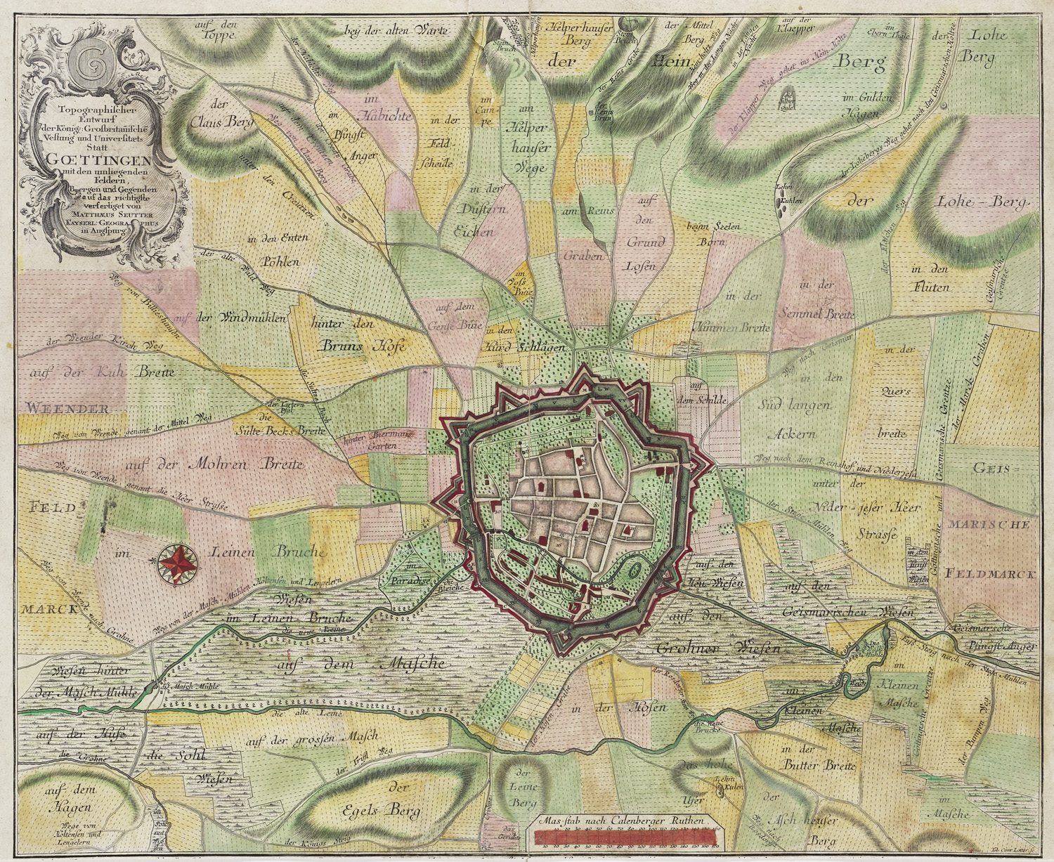 Topographischer Entwurf der Königl. Großbritannischen Vestung und Universitaets Statt Goettingen mit den umliegenden Feldern, Bergen und Gegenden (....). Kolorierte Kupferstichkarte. Augsburg, Matthaeus Seutter, um 1731. 48,2 x 61 cm. Fest auf Karton kaschiert.