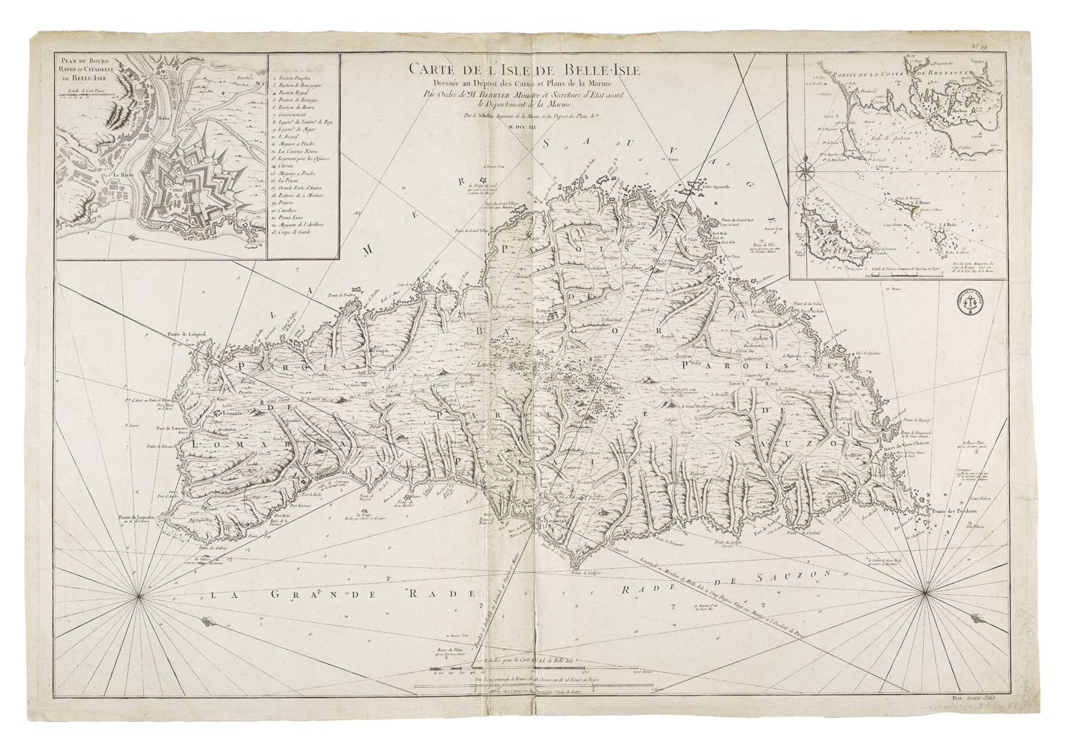 Carte de Isle de Belle-Isle. Depot de la Marine. 1761. Kupferstichkarte. 61,1 cm x 90,2 cm (63 x 93,4 cm).