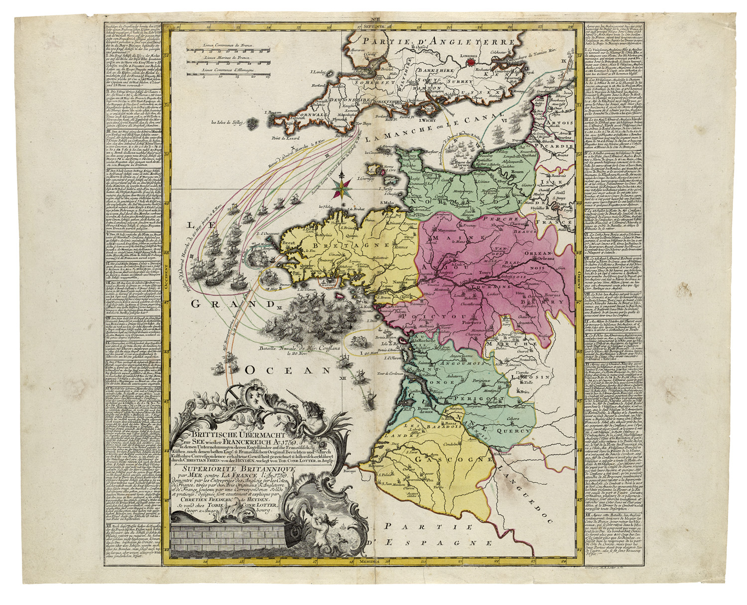 Dekorative Graphik - Karten – Ritter. Die Welt aus Augsburg. Nr. 67 - Eins von zwei Blättern, das erste Blatt erschien 1758. - Karte zum Siebenjährigen Krieg mit Darstellung der Schiffsbewegungen im Kanal zwischen England und Frankreich sowie im Atlantik vor der französischen Küste. Mit einer reich dekorierten Titelkartusche in der linken unteren Ecke und Erklärungen zur Seeblockade Frankreichs durch die Engländer am rechten und linken Rand. - Mittelfalz verso verstärkt. Fleckig, leichte Randläsuren. Insgesamt gut erhaltene Karte in schönem Kolorit.