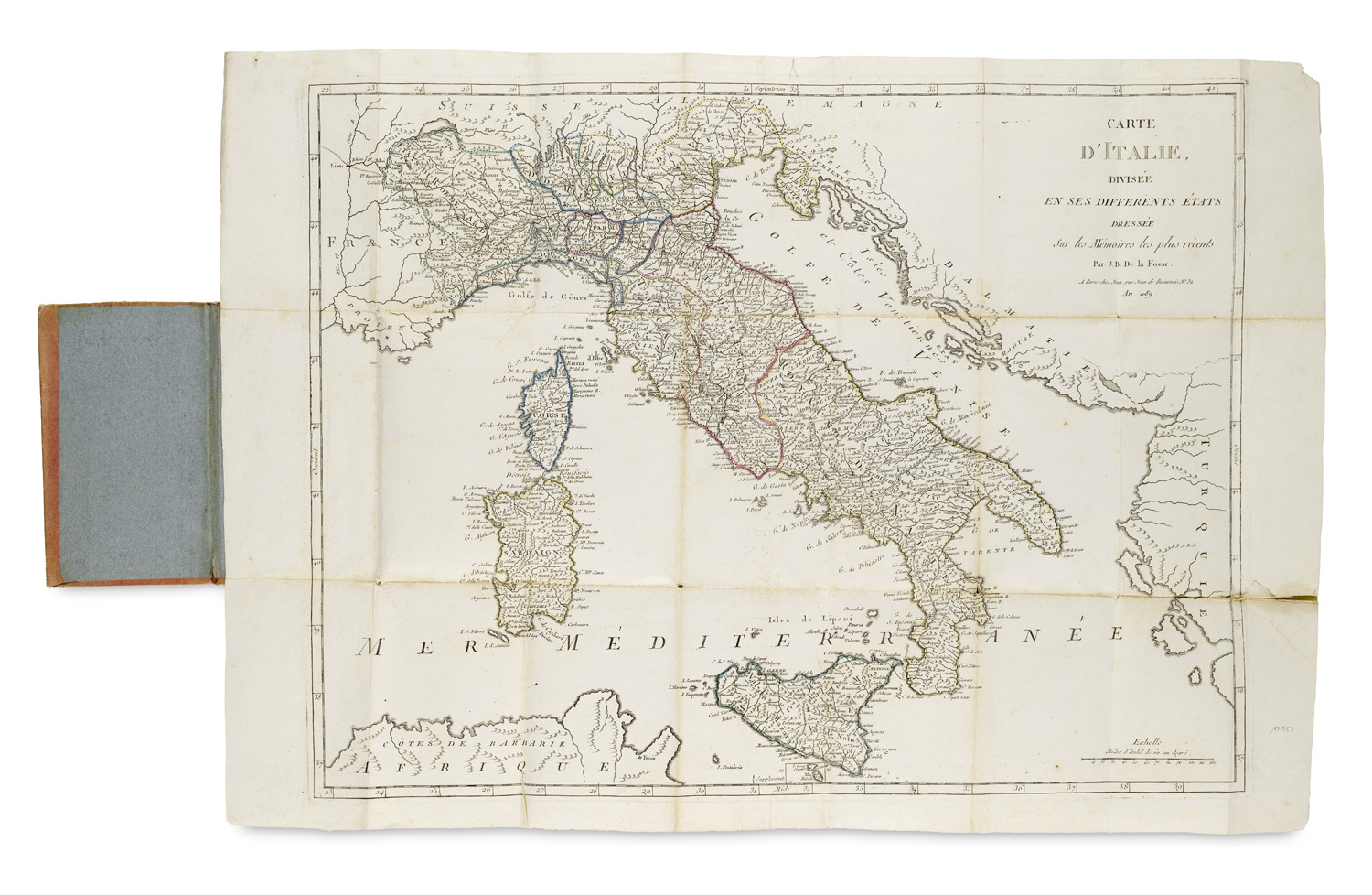 Carte d' Italie, divisée en ses differrents Ètats Dressée sur les Memoires les plus recents. Par J.B. De la Fosse. A Paris chez Jean (...) An 1089. 1799. Kupferkarte mit altem Grenzkolorit. 52 x 68 cm. Gefaltet und montiert in Pp. Einband.