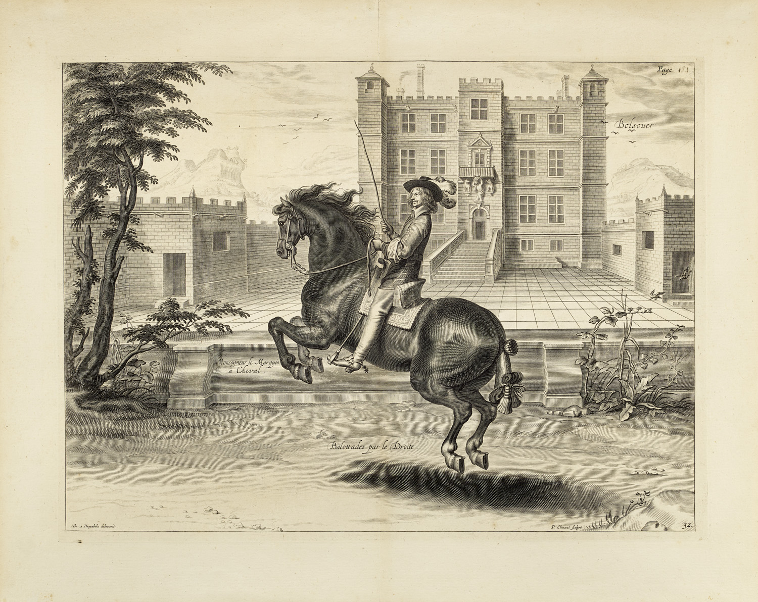 Dekorative Graphik - Genre – Enthält: William Cavendish, Méthode et invention nouvelle de dresser les chevaux. Darunter La Bataille Gaignée (Fol. 1), Le Superbe Cheval de Spanie (Fol. 7), Mackomilia un Turke (Fol. 8), Nobilissimo Coursier Nappolitain (Fol. 9), Les poulins (Fol. 12), Monseigneur le Marquis estant à cheval, pour Mônsrer la vraije assiette du Cavalie (Fol. 14), Le Capitaine Mazin monte, et Monseigneur le Marquis donne leçon (Fol. 19), Monseigneur le Marquis à Cheval. Groupades par le Droite (Fol. 31), Balottades par le Droite (Fol. 32) und Caprioles par le Droite (Fol. 33), Monseigneur le Marquis à cheval. Groupades sur les Voltes à main gauche (Fol. 35). Die zuerst 1657/58 in Antwerpen erschienene Folge wurde später mehrfach neu aufgelegt, darunter 1667 und 1737, eine englische Bearbeitung erschien 1743 in London unter dem Titel A General System of Horsemanship in All Its Branches. Die Druckgrafiken gehören zu einer der bedeutendsten Reitlehrwerke des 17. Jahrhunderts. Die Folge verbindet Lehrtafeln der barocken Reitkunst mit Pferdeporträts und Ansichten von Welbeck und Bolsover. Die Kupferstiche wurden nach Entwürfen Abraham van Diepenbeecks von mehreren Antwerpener Stechern ausgeführt und gehören zu den klassischen Bildzeugnissen der höfischen Haute École.