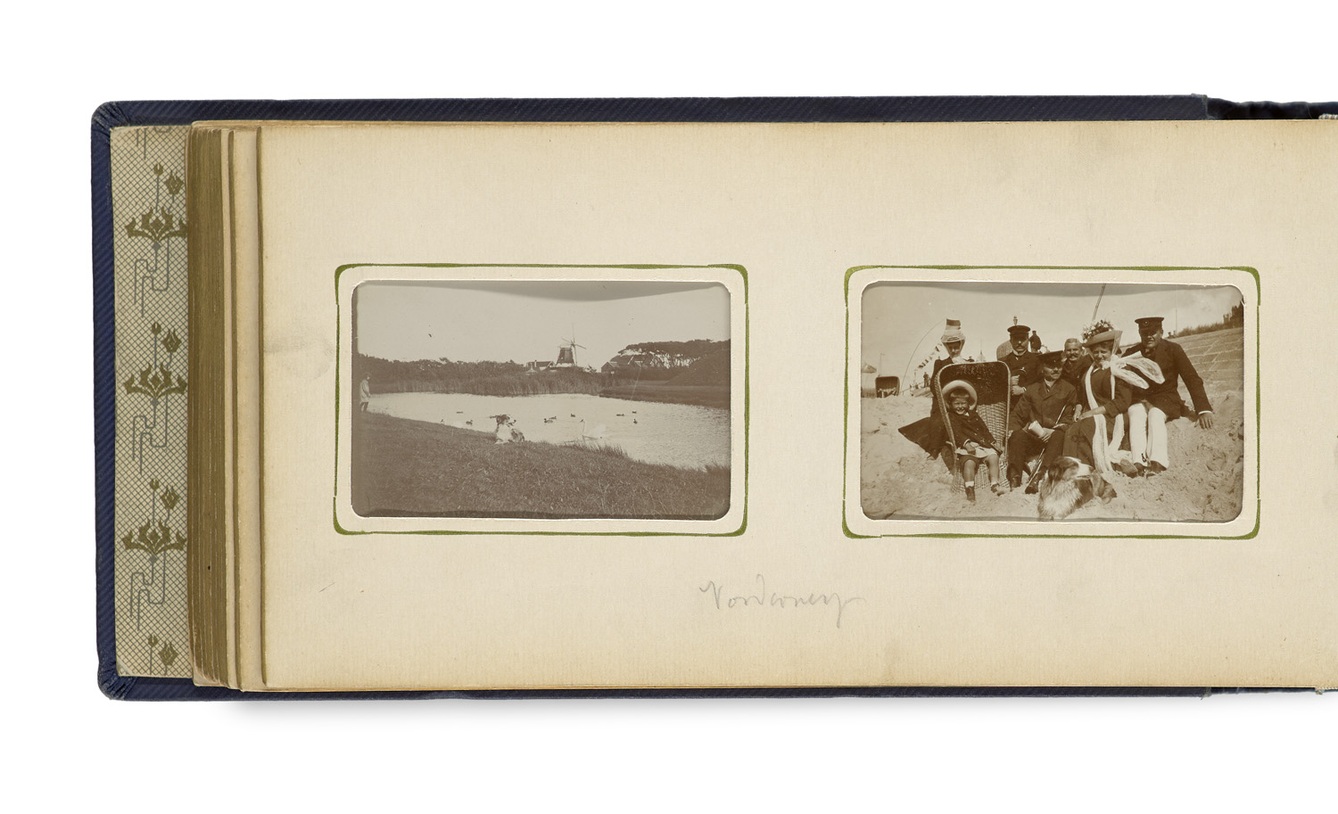 Photography – Photo album containing over 100 travel photographs. Mounted in a canvas album with a gold-stamped title and gilt edges (worn and scuffed, spine slightly cracked). - The photographs depict sights and landscapes in, among other places, Scandinavia, the Valdres Valley, Bergen, Copenhagen, Norderney, Zurich, Frankfurt, Lugano, and Milan. Also includes some family photos. Mostly hand-titled below the photographs. - Overall in good condition.