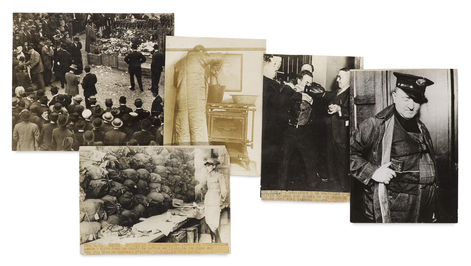 Photography – Press photography - Drugs - Collection of 5 rare press photographs. Silver gelatin prints. - Mostly stamped and with predominantly French, some English or German, some mounted handwr. and typographic descriptive texts on verso. - The photographs show: Public burning of opium in Chinatown. 1912 (?) (verso inscribed '$20,000 worth of (cut)... in Chinatown 5/10/12'). - One of the first photographs ever taken inside a Chinese opium den in New York (Press-Photo-News-Service). - US customs officer displaying an opium smuggler's jacket (Agence photographique Keystone, Paris). - Arrest of opium dealer Willi Bonanzi, N.Y. 1937 (ibid.). - Opium smuggling uncovered in Piraeus 1935 (France Press, Paris). - 2 prints with bend, 1 slightly silvered, otherwise in good condition overall.