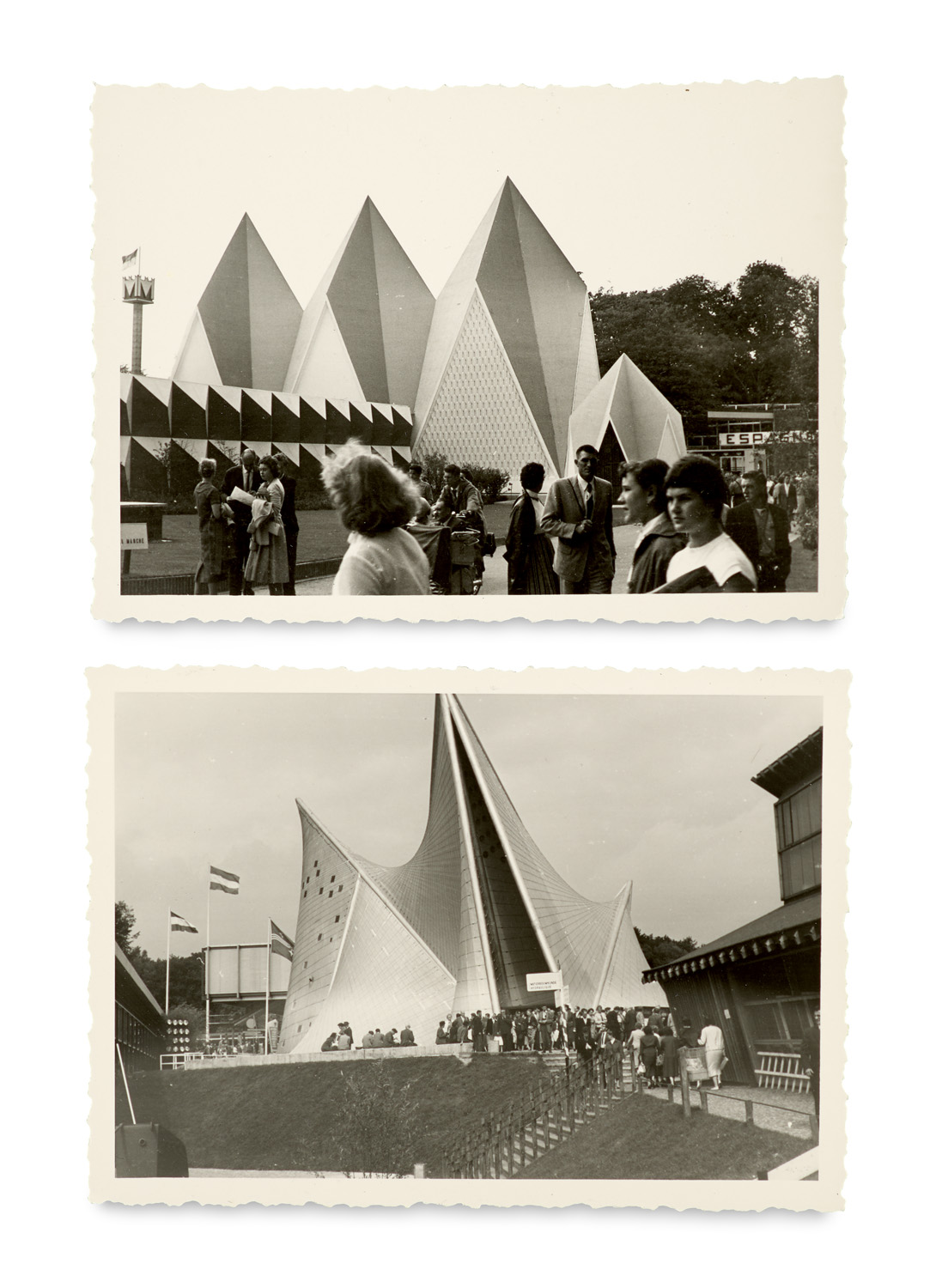 Photography – Collection of 33 original photographs from the 1958 World's Fair (Expo 58) in Brussels. Gelatin silver prints on Leonar paper. Vintage prints. Each approx. 7.3 x 10 cm. - Contains numerous photographs of the important pavilions. - Expo 58 in Brussels was above all a showcase of modern architecture, in which several buildings and architects became emblematic of the self-image of the "atomic age." The most impressive structure shaping the image of the exhibition was the Atomium by André Waterkeyn (with Jean and André Polak as the executing architects): the 102-meter-high steel construction enlarges an elementary cell of the iron crystal by a factor of billions, connects nine spheres by tubes and escalators, and thus stages heavy industry, engineering skill, and faith in the future in a single walk-in sculpture. At the foot of the Atomium lay the monumental halls of the Heysel plateau, among them the stepped "Jahrhunderthallen" complex, erected already for the 1935 exhibition with its broad projecting central block, which served as the main pavilion and combined interwar architecture with the new lightness of the 1950s. Particularly influential was the pavilion of the Federal Republic of Germany by Sep Ruf and Egon Eiermann: a loose group of eight right-angled, flat-roofed pavilions, arranged around a courtyard and connected by walkways, whose permeable façades, extensive glazing, and slender supports symbolized transparency, openness, and a democratic new beginning. Another key work was the Czechoslovak pavilion by the architects Frantisek Cubr, Josef Hrubý, and Zdenek Pokorný, whose light, glazed structure, seemingly floating on supports, and clear, geometric formal language became the prototype of the so-called "Brussels style" and was awarded the prestigious Golden Star Prize for this design. In addition, numerous other national pavilions with bold roof constructions and column-free halls - for example the large, domed U.S. pavilion - contributed to the impression that contemporary observers described Expo 58 as an "affair of the architects" and a "fair of roofs," in which new structural systems, transparent façades, and technical symbolism were more important than pure façade representation. - Well preserved.