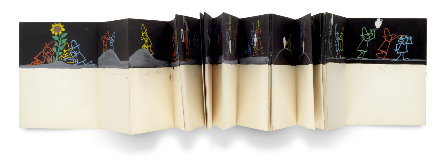 Varia and Miscellaneous – Original storyboard of the animated film "Tri Muzi". Leporello with handwritten title (heavily rubbed and bumped, stained). - With handwritten card attesting to the book's authenticity. - Handmade leporello by Vladimir Lehký containing the storyboard for his cartoon "Tri Muzi". "Tri Muzi" (Three Men) was created in 1959 and screened at the Venice Film Festival in 1960, where it won first prize in the animation category. It was also screened at the Melbourne Film Festival in 1962. - The top of each page is blacked out and partly has a handwritten title below the drawing. - Some pages are slightly stained. Overall in good condition.