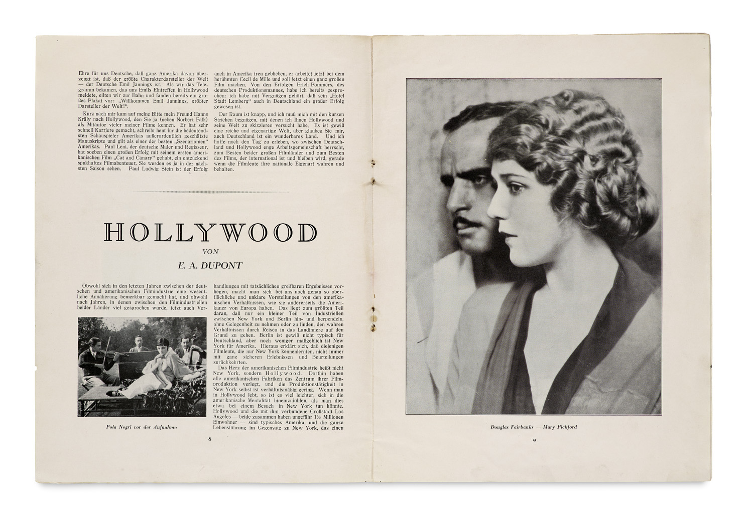 Varia and Miscellaneous – With numerous photographic illustrations. Illustrated brochure (heavily worn, with tears, spine broken). - Extremely rare. - Second edition about early Hollywood with contributions from German film directors Ernst Lubitsch and Ewald André Dupont about early Hollywood cinema and details about Hollywood's production methods, budgets, editing techniques, and actors. - Some water stains on the binding, slightly wavy. Overall in good condition.