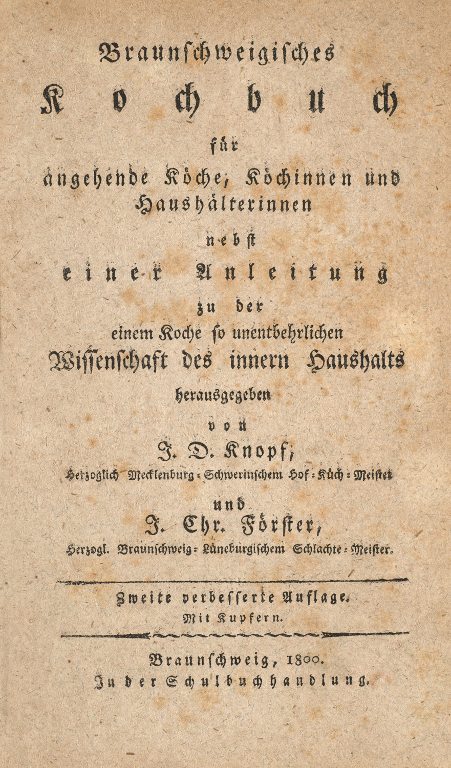 Braunschweigisches Kochbuch für angehende Köche, Köchinnen, Haushälterinnen und Hausmütter. Nebst einer Anleitung zu der so unentbehrlichen Wissenschaft des inneren Haushalts. 2. verb. Aufl. Mit 3 gefalteten Kupfern. Braunschweig, Schulbuchhandlung, 1800. XIV S., 1 Bl., 686 Seiten, 1 Bl. (Spät.) Halbleinwand.