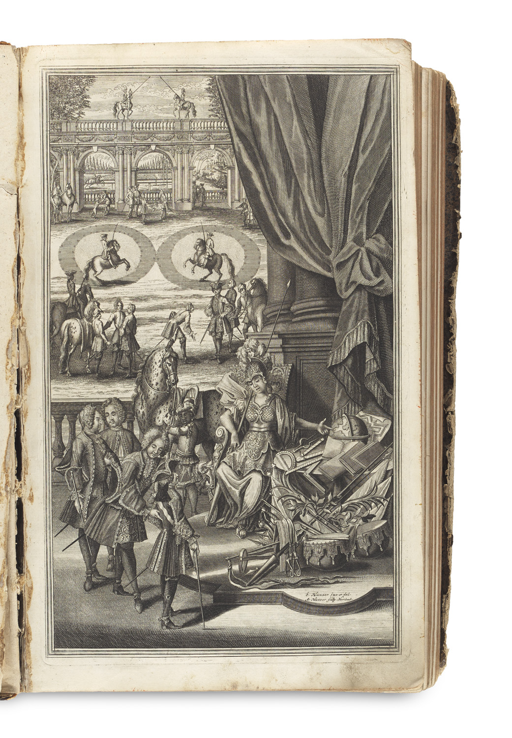 Varia and Miscellaneous – With engraved frontispiece and 61 (of 62, withouth the engraving with coat of arms) copper engraved plates, of which 11 folding. Bound in contemporary folio cardboard (without spine, front board with fault, which is enclosed), worn throughout. - Completely revised and expanded edition of Löhneysen's work "Della Cavalleria", first published in 1609 by his own publisher. - The magnificent large-format engravings by A. and E. Nunzer were newly engraved for Trichter's edition and depict various horse breeds, dressage exercises, tournament scenes, triumphal processions, bridles, saddles, and stables. - The coat of arms engraving is missing. - Somewhat browned and occasionally lightly foxed, the clear engravings are mostly clean.