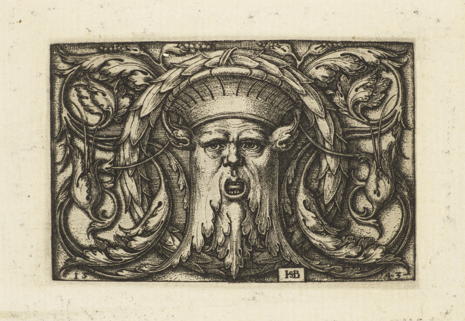 Die Querfüllung mit der Maske. 1543. Kupferstich auf Bütten. 7,5 x 10,5 cm (16 x 24 cm). In der Platte monogrammiert und datiert. Ganzflächig auf Papier aufgezogen.