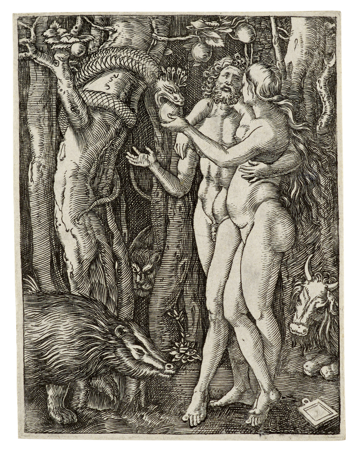 Adam und Eva (der Sündenfall). Italien um 1515. Kupferstich. 13 x 10 cm. - Ecken geringfügig bestoßen. Leichter Abrieb im schmalen Rand. Prachtvoller, satter Stich in einer filigranen Ausführung.