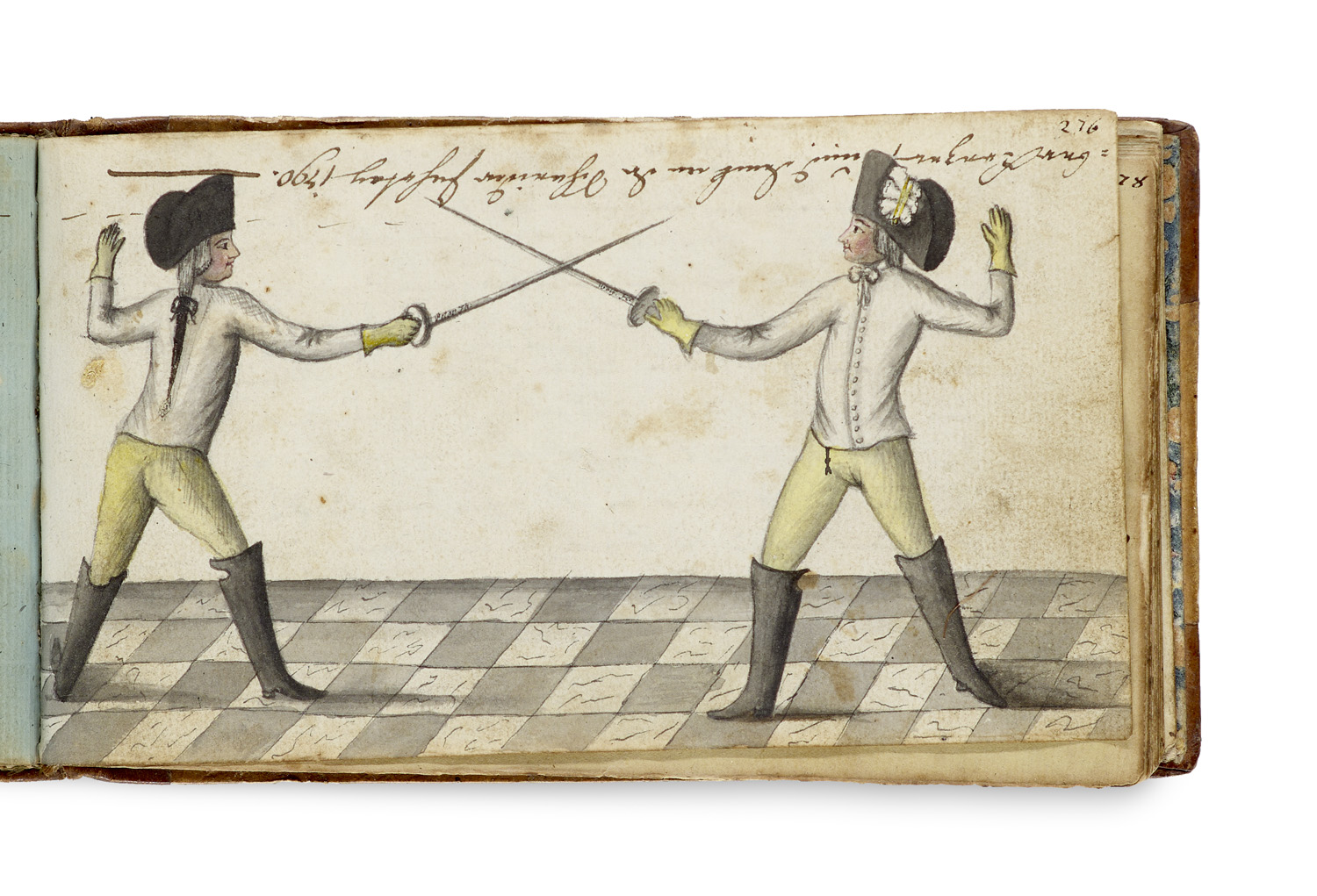 Manuscripts – Rhineland-Palatinate - Liber amicorum with approx. 80 entries, mostly by law and theology students, 6 watercolours and watercoloured drawings, 1 pencil drawing and 6 silhouette portraits. Contemp. half leather with gilt edges, spine gilt and gilt stamped title 'Stammbuch' to spine (rubbed). - With entries, symbols and aphorisms from fraternity brothers of the 'high school in Mainz', including, among others, as listed above. - The watercolours and drawings depict, among other things: Monument of friendship, 5 soldiers with a dog writing in a liber amicorum, study room with two men and the note 'Long borrowed and well paid is not a gift' (trans.), duel, with the names 'Peter Th:' and "Wolf. Fer." entered in small letters on the swords - Appendix with 3 pages of names. - Modern monogram stamp. - Inner joints chipped, some browning due to paper, some brown and finger stains throughout, 2 pages with cut-outs, otherwise overall good condition.