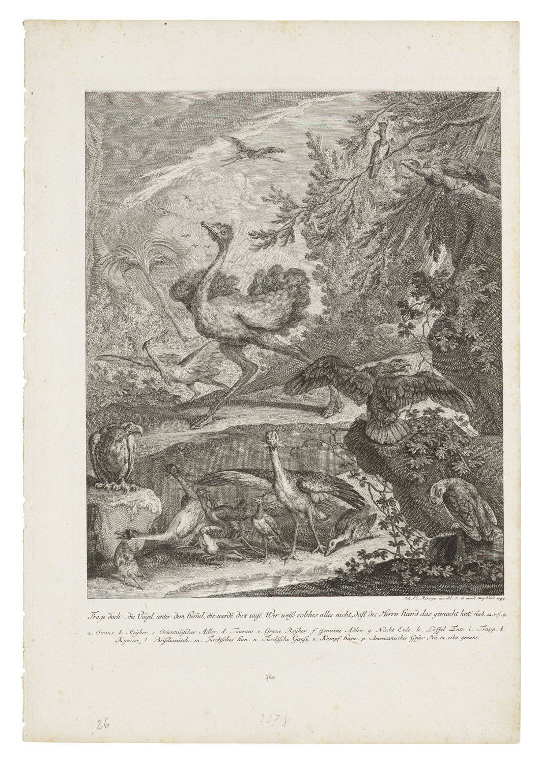 Sammlung von 4 Arbeiten mit Vogeldarstellungen. Deutschland, Mitte des 18. Jahrhundert. Je Radierung auf Bütten. 34 x 25,5 cm. In der Platte bezeichnet und datiert.