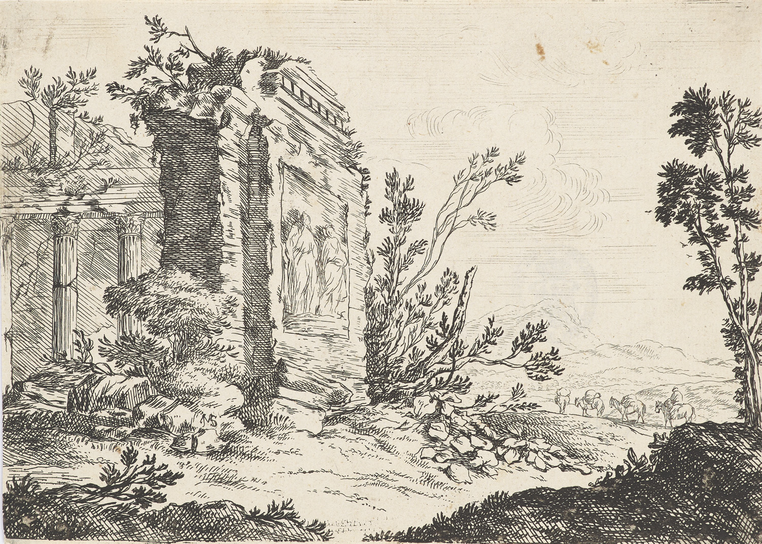 Paintings, drawings and prints 16th to 19th century – Collection of 6 etchings with Italian landscapes. Second half of the 17th century. Each etching on vergé. Each monogrammed in the plate. Each mounted in pairs on backing. - Very rare. - With various collector's stamps verso: see above. - According to new research, these are works by Johann Melchior, who was long referred to as 'Martin' and about whose life circumstances little is still known. - Trimmed to the platemark or depiction. Collector's stamps partly slightly visible recto. Inconspicuous brownstaining. Overall in very good condition, excellent impression.