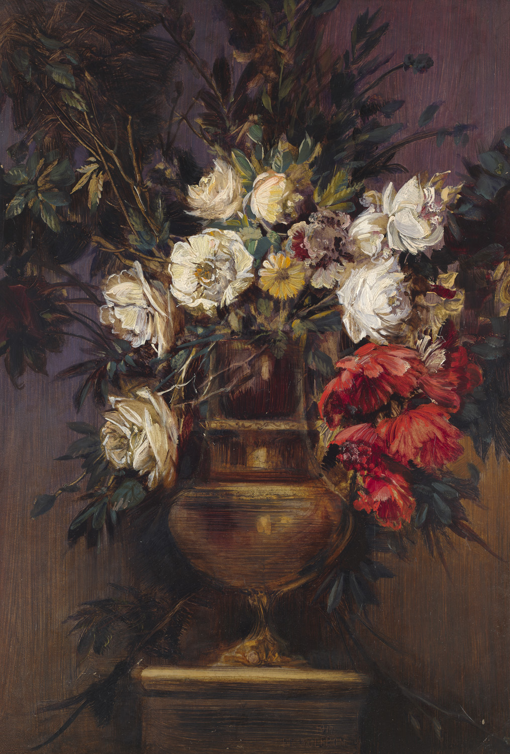Gemälde, Zeichnungen u. Grafiken 16. bis 19. Jhd. – Das üppige Blumenarrangement entfaltet sich in einem faszinierenden Wechsel aus zarten und kräftigen Pinselstrichen über nahezu den gesamten oberen Bildraum. Die hierdurch entstehende Tiefe sowie Textur erzeugen eine Lebendigkeit, welche in einem spannungsvollen Kontrast zu der Stabilität des Sockels und der Vase stehen, in welcher das Bouquet präsentiert wird. - Partiell mit kleinen Knickspuren, vereinzelt mit kl. und recht unscheinbaren Farbabplatzungen, unter UV keine Retuschen erkennbar. Insgesamt sehr gut erhalten.