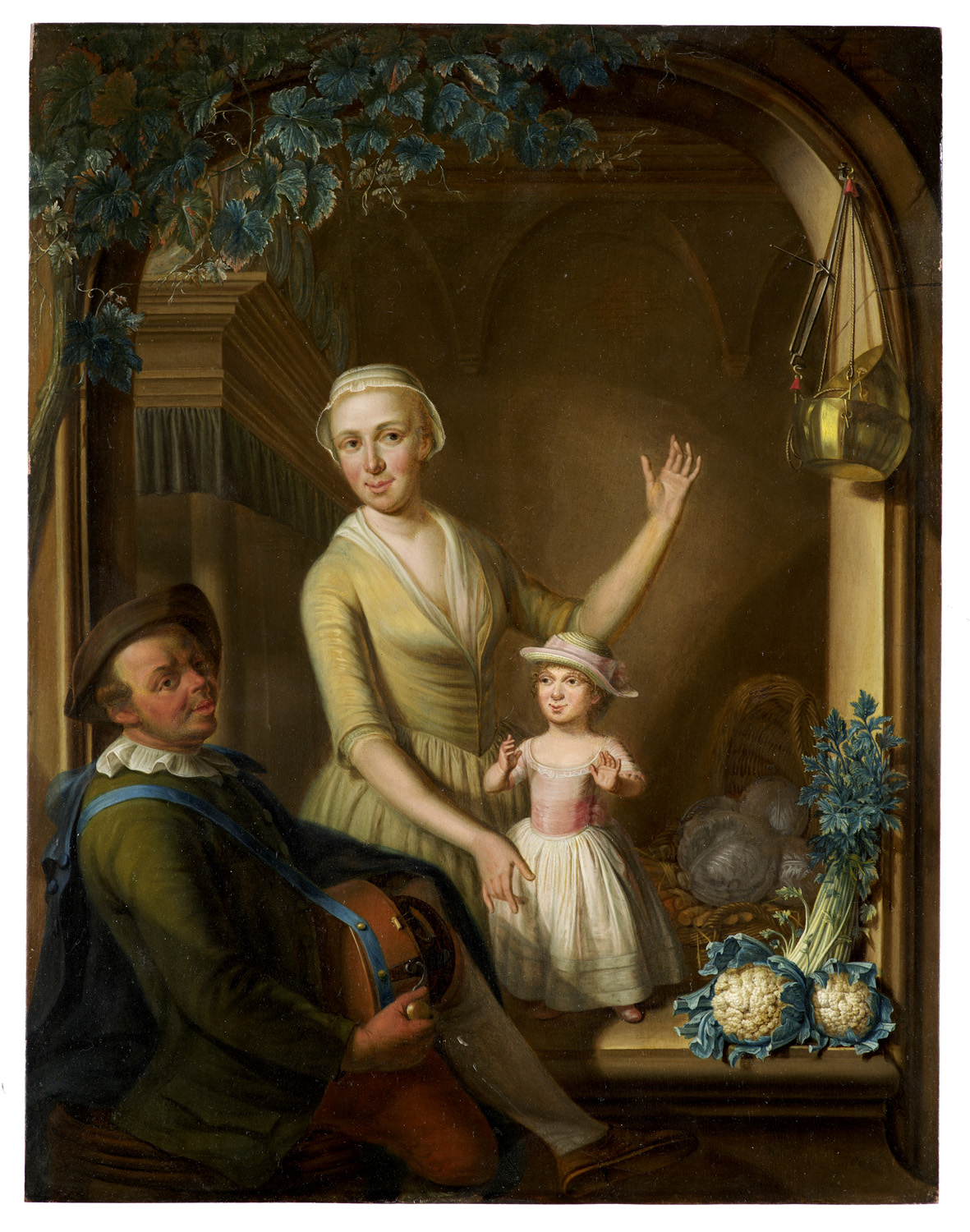 Gemälde, Zeichnungen u. Grafiken 16. bis 19. Jhd. – Nicolaas Reyers war Maler von Bildnissen, Surporten und Kaminstücken in Leiden und Schüler des 1687 geborenen Malers Hieronymus van der My. Bei unserer Ansicht handelt es sich um eine bürgerliche Genreszene mit der Darstellung einer Gemüseverkäuferin und eines Musikanten in detailgetreuer, feinmalerischer Ausführung. Die Lichtführung und Detailtreue sowie die Ausbildung bei van der My lassen auf den Einfluss der "Fijnschilderkunst" Anfang des 18. Jahrhunderts schließen.