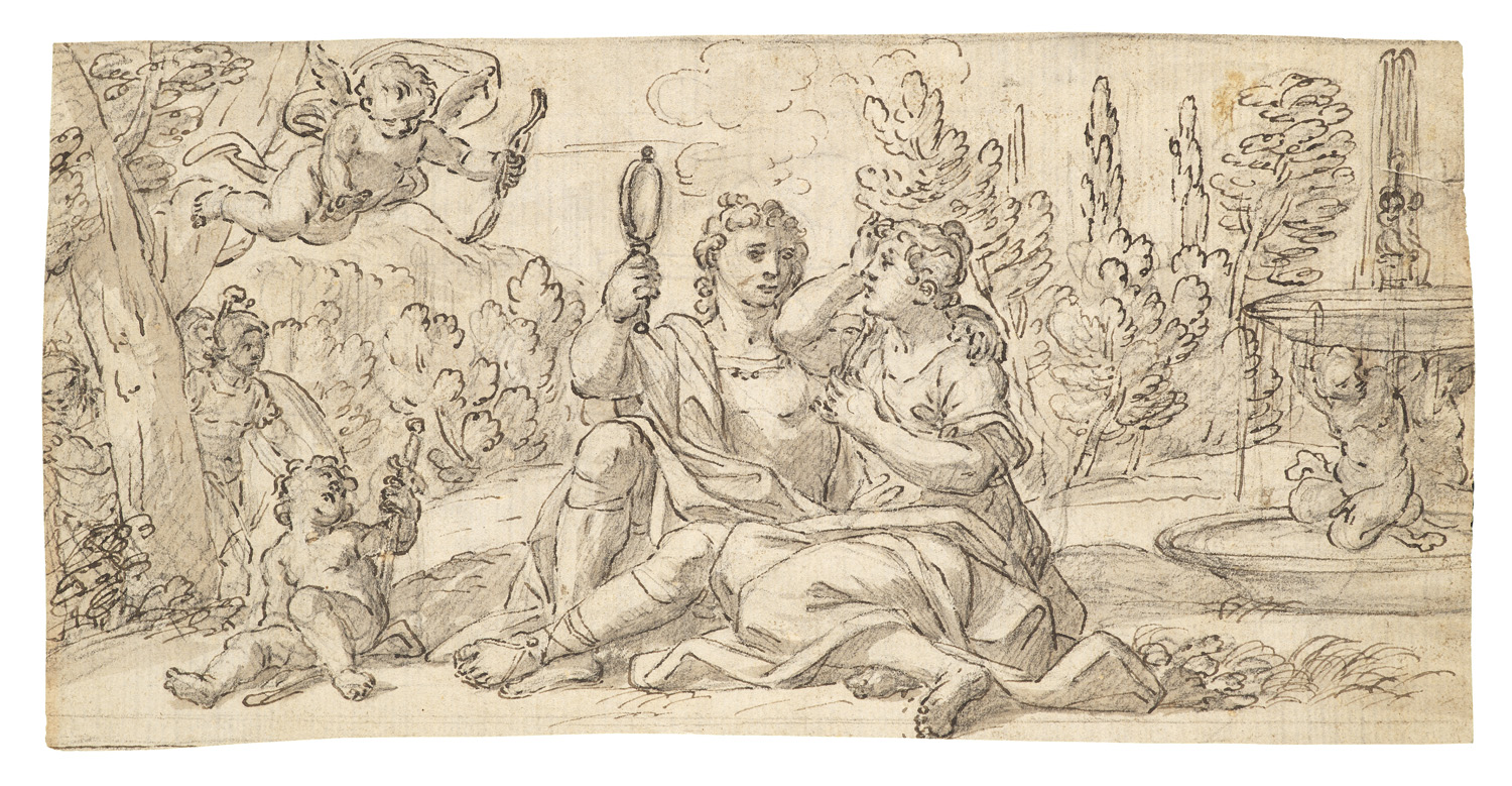 Rinaldo und Armida. 2. Hälfte 17. Jh. Feder in Braun über Bleistift auf Bütten (mit nicht identifizierbarem WZ mit Stern). 13 x 26,5 cm. Verso betitelt "Rinaldo Armida" sowie bezeichnet "Navaretta inv.". - Die seitlichen Ränder leicht unregelmäßig beschnitten, rechts mit einem Randeinriss (ca. 1,5 cm). Punktuell wenige, schwache braune Flecken. Verso mit Spuren der ehemaligen Montierung. Insgesamt gut. Liebliche Szene mit skizzenhaftem und illustrativem Charakter.