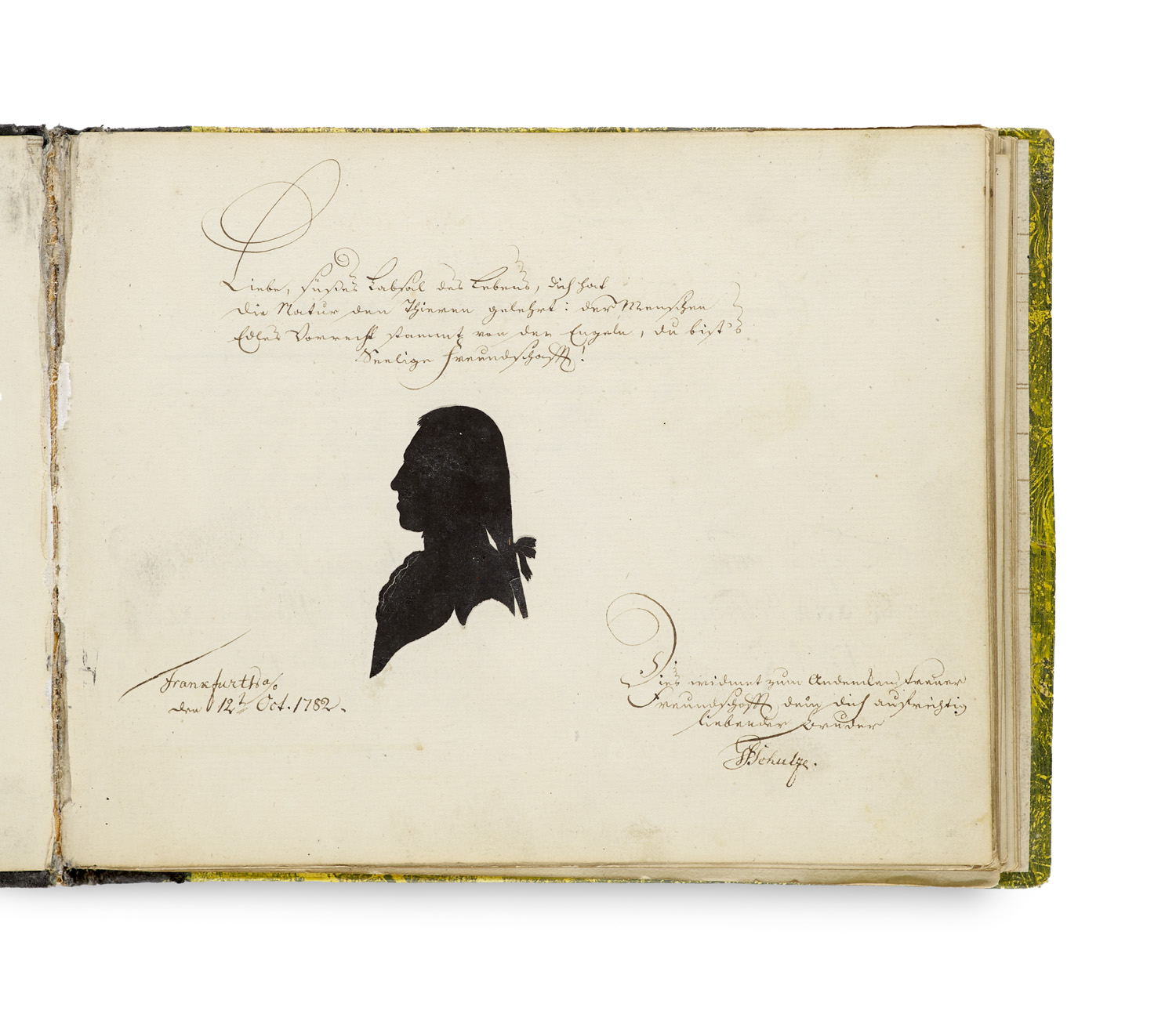 Manuscripts – Saxony-Anhalt - Hesse - Liber amicorum with 45 entries and 2 mounted silhouette portraits. Contemp. half leather with gilt edges and coloured paper cover (rubbed and slightly bumped). - Entries by, among others: as listed above. - A few sheets with cuts on the fold, 2 sheets stuck together and partly with defects, some brown and fingerstains, otherwise in good condition overall.