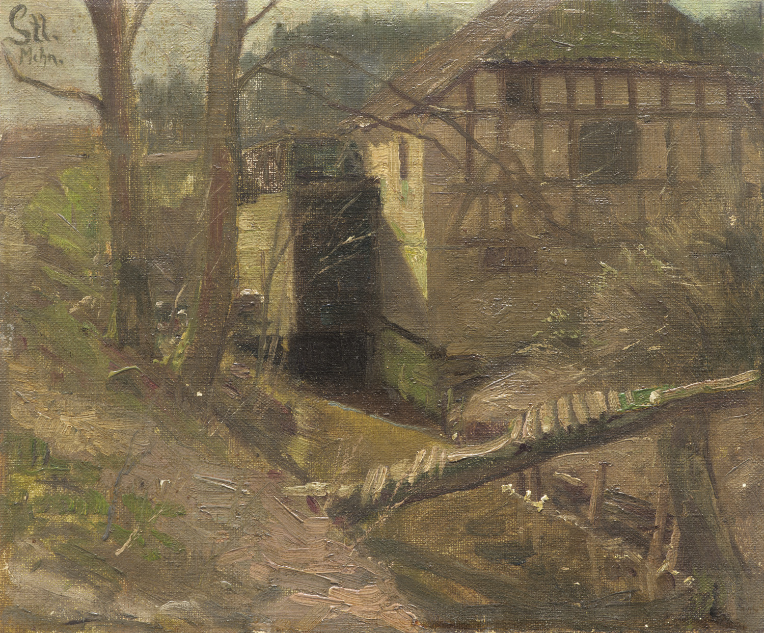 Dorfmühle. Um 1900. Öl auf Hartfaserplatte. 22,5 x 26,5 cm. Monogrammiert und bezeichnet "Mchn". Gerahmt.