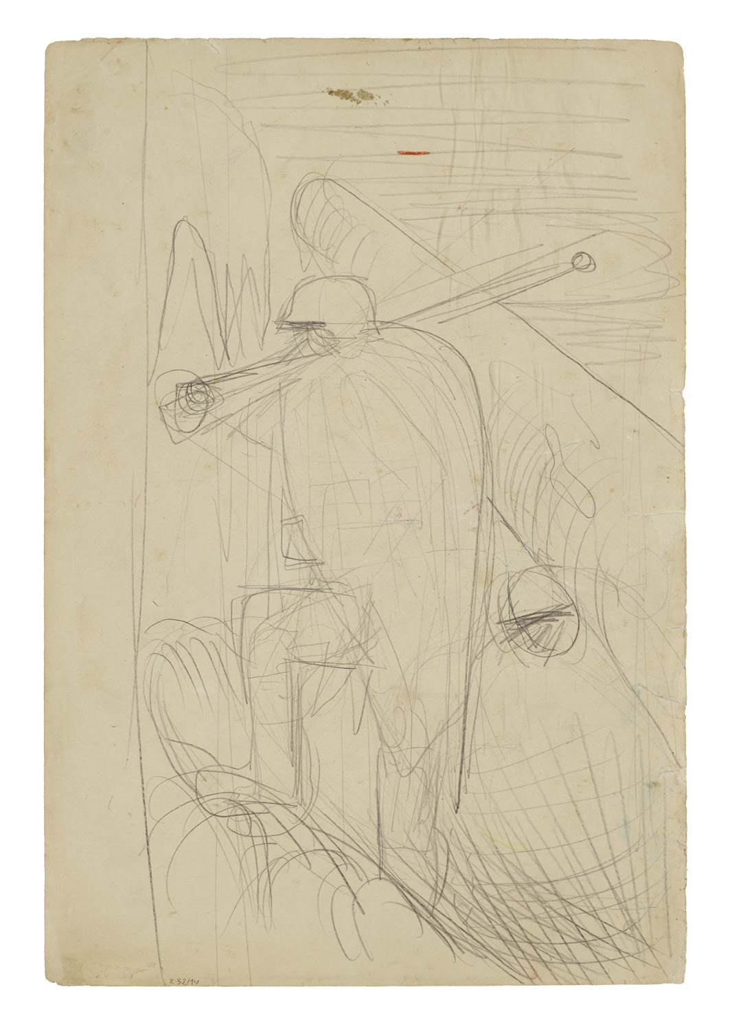 Paintings, drawings and prints 16th to 19th century – Pencil on vellum. Inscribed by a third party. The sheet is slightly discoloured in places due to age, with faint creases, the edges are slightly irregular and have minor tears of a few millimetres. Overall, very good condition. - Löffler 1932/4. Lorenz NSk 7.3.24. - A drawing by Otto Dix from the period of his retrospective engagement with the First World War, in which he translates his impressions of violence and destruction into a ruthlessly precise visual language. Using rapid, fragmented lines, Dix depicts the figure of the soldier, whose upward movement remains ambivalent, oscillating between vitality and the impression of a war machine, thus, rather than glorifying him, the work addresses the enduring trauma and dehumanisation of modern warfare.