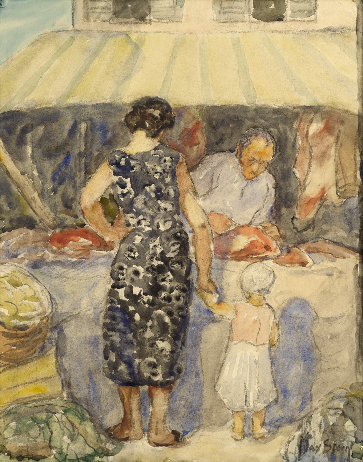 Gemälde, Zeichnungen u. Grafiken 16. bis 19. Jhd. – Privatsammlung, Berlin. - Das vorliegende Aquarell von Max Stern steht stilistisch im Kontext der neusachlichen und spätimpressionistischen Tendenzen der Weimarer Zeit. Mit nuanciert-transparenter Farbgebung und sicherer Linienführung verdichtet Stern die alltägliche Szene einer Frau mit Kind am Marktstand zu einer lebendigen Komposition mit atmosphärischer Licht- und Temperaturstimmung. - Papier altersbedingt leicht gebräunt, an den Ecken je mit einem kleinen, kaum merklichen Nadellöchlein. Verso mit punktuellen, dunklen Flecken sowie Spuren einer Kreideskizze. Insgesamt sehr gut.