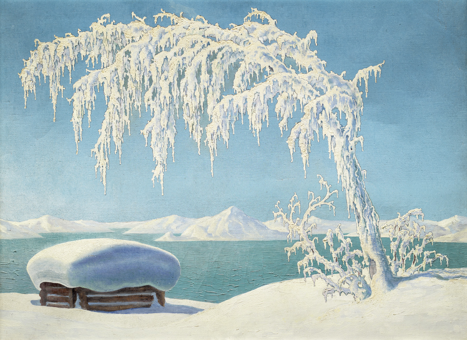 Gemälde, Zeichnungen u. Grafiken 16. bis 19. Jhd. – Provenienz: Aus dem Besitz der Familie des Künstlers. - Großformatige Darstellung mit einer vereisten Landschaft mit einer Trauerweide an einem See im Vordergrund und mehreren Eisbergen im Hintergrund. Trotz der Ruhe, die dieses Werk durch die schneebedeckte Natur ausstrahlt, schafft es von Riesen hier in den detaillierten Verzweigungen der gefrorenen Astformationen eine sphärische Wirkung zu erzeugen.