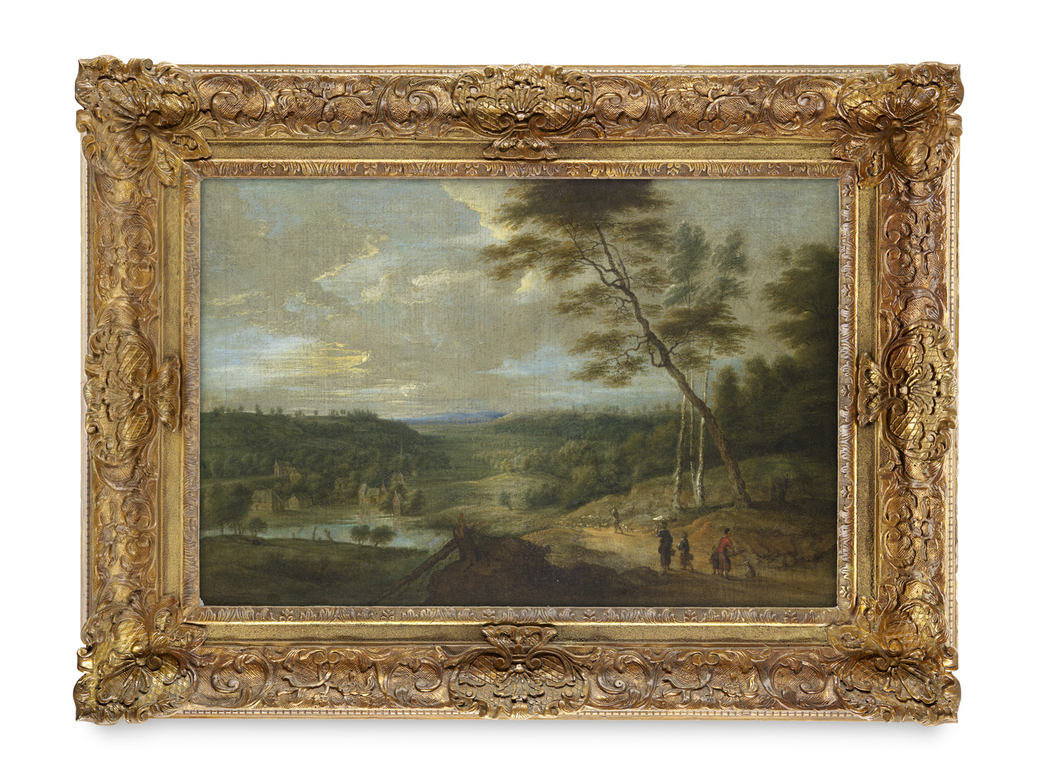 Paintings, drawings and prints 16th to 19th century – Oil on canvas. Framed. - With fine craquelure, occasional tiny paint flakes. Partially slightly dusty. Minor surface abrasions. Edges slightly rubbed. Overall good. Harmonious composition with dramatic light depiction. - The composition is reminiscent of the work of Lucas van Uden, one of the most important Flemish landscape painters of the 17th century. The wide-open landscape with a river, village architecture and small figures corresponds to the calmly structured view of nature that is characteristic of Antwerp landscape painting.