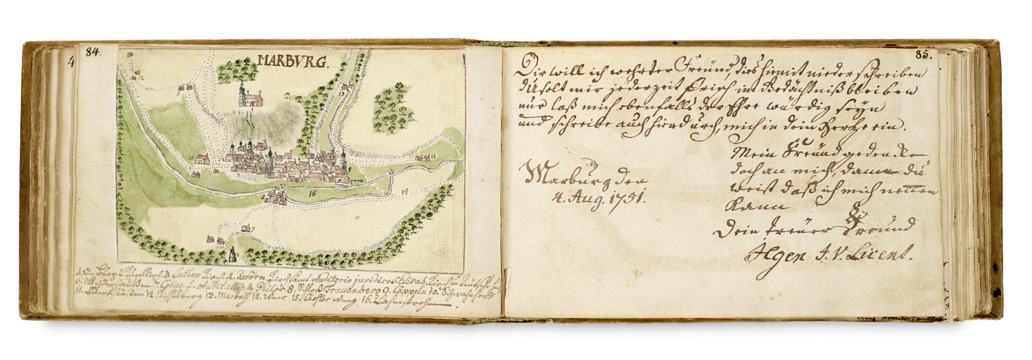 Stammbuch des J.F.L. v. Mülmann, u.a. aus seiner Studentenzeit. Mit ca. 58 Einträgen, 15 kol. gestoch. Abb., 1 kol. gezeichneten Plan von Marburg, 3 aquarellierten Zeichnungen (1 auf Pergament) u. 1 Gouache. Um 1750-1774. Quer-8°. Braunes, blindgepr. Pgt. d. Zt. mit Goldschnitt (leicht bestoßen, berieben).