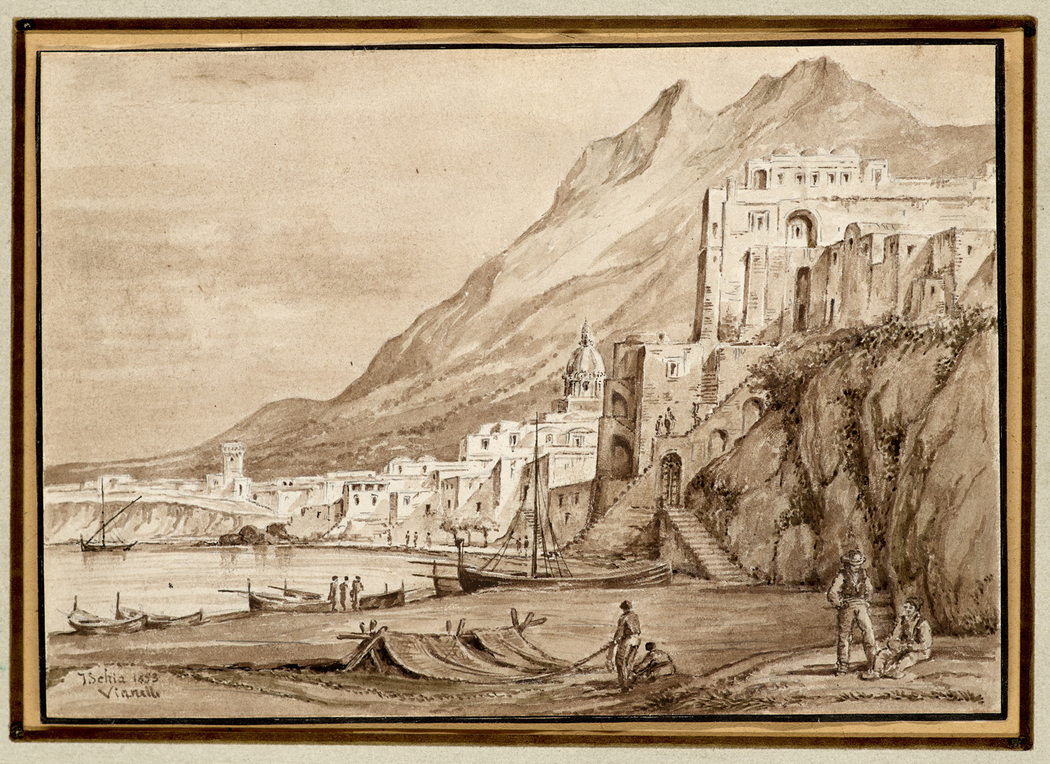 Paintings, drawings and prints 16th to 19th century – Italy. - Signed, dated and titled. Mounted on backing and cut out in passe-partout. - Paper slightly browned, a few tiny, barely noticeable brown spots. Verso with inscription by another hand and remnants of previous mounting. Overall very good. - Private collection, Northern Germany. - Veduta-like landscape depiction of the island of Ischia by Achille Vianelli, who, with his proximity to the Scuola di Posillipo, ranks among the important representatives of 19th-century Neapolitan landscape painting and, together with his contemporaries, established a new, atmospherically sensitive conception of landscape. Transparent glazes and finely graded contrasts create a subtle sense of depth, with architecture and vegetation appearing clearly contoured against the calm water modulated by Mediterranean light.