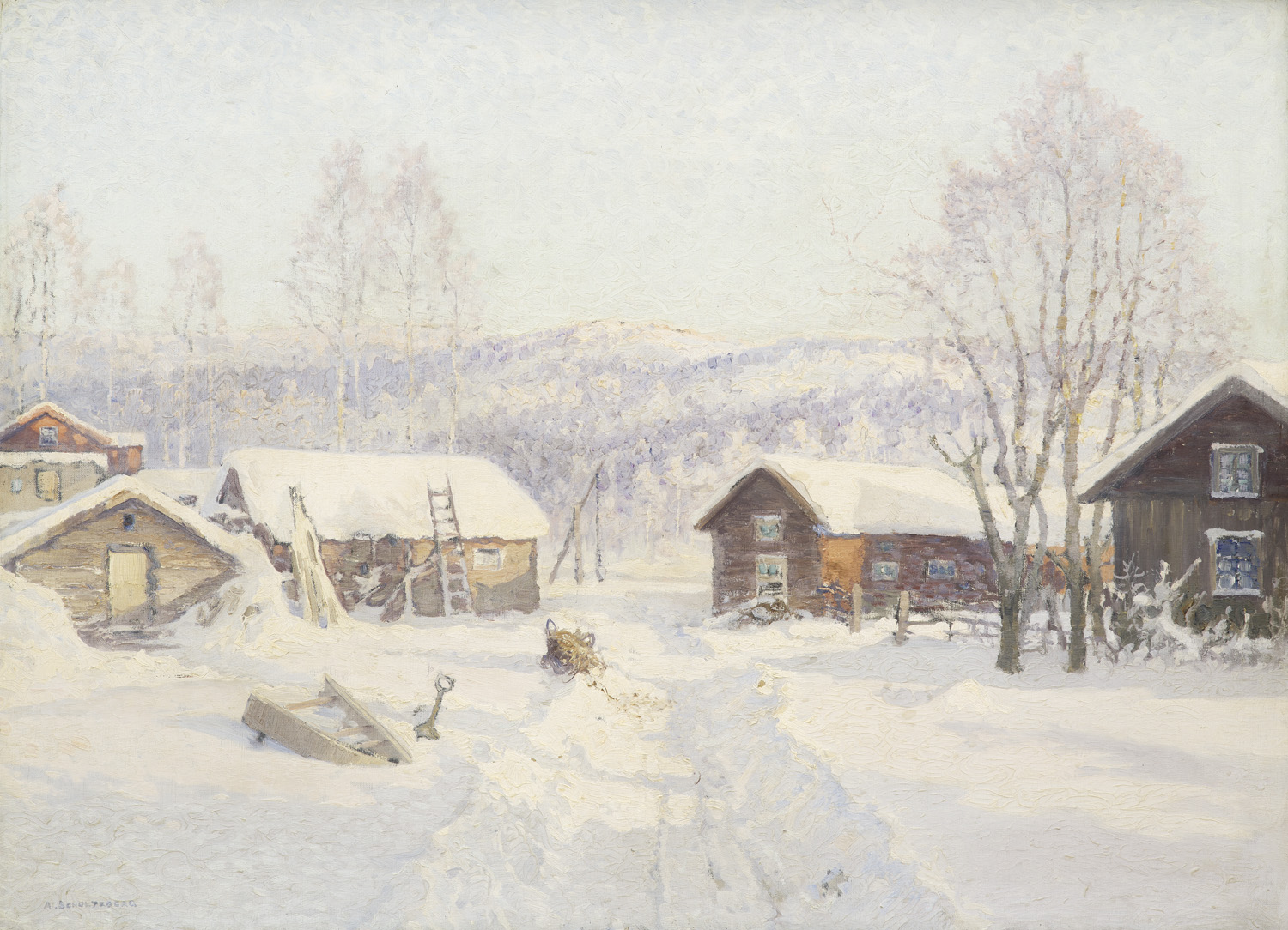 Aus einem Dorf in Tunaslätten (Dalarna). Um die 1910er Jahre. Öl auf Leinwand. 99 x 72,5 cm. Signiert und verso am Keilrahmen in Schwedisch betitelt sowie mit Etikett, dort mit weiteren Werksangaben in Deutsch. Gerahmt. - Punktuell einige wenige Farbabplatzer. Mit altersbedingtem Craquelée. Vereinzelt weiße Wachsspritzer auf der Maloberfläche. Insgesamt in gutem Zustand. Prächtige Schneelandschaft bei strahlendem Sonnenschein.