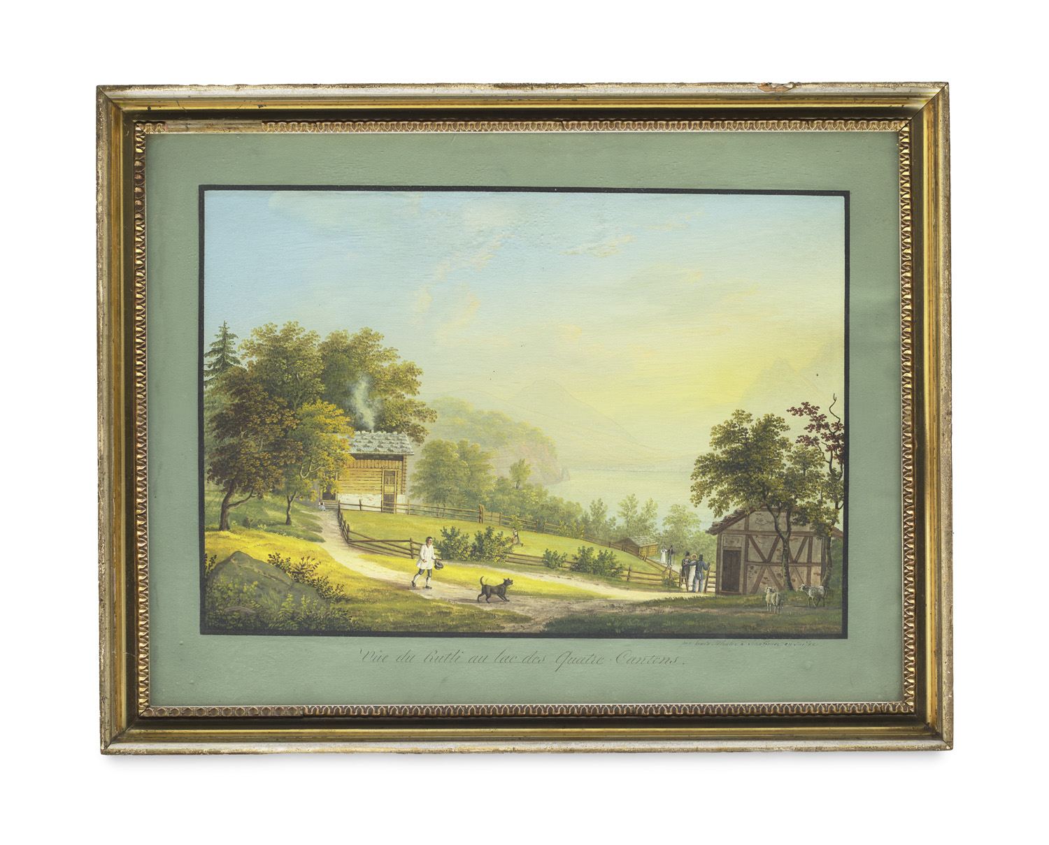 Paintings, drawings and prints 16th to 19th century – Titled and inscribed. Framed under glass. - Slightly warped due to the material. Surface with occasional slight rubbing. Isolated minimal brown spots. Overall excellent condition with fresh colouring. - The view is one of the popular Swiss vedute published by Bleuler, which were distributed in the 19th century as representative travel sheets. It depicts the Rütli on Lake Lucerne, a historically significant place that is considered the symbolic setting of the Swiss founding myth. Bleuler's work is characterised by a combination of topographical accuracy and finely tuned, picturesque colouring that particularly emphasises the scenic charm of the Swiss Alpine region. - Bleuler worked in a productive veduta workshop in Schaffhausen, where views of Switzerland were printed and then coloured with gouache. These landscape prints were sold in the 19th century as decorative travel and souvenir graphics.