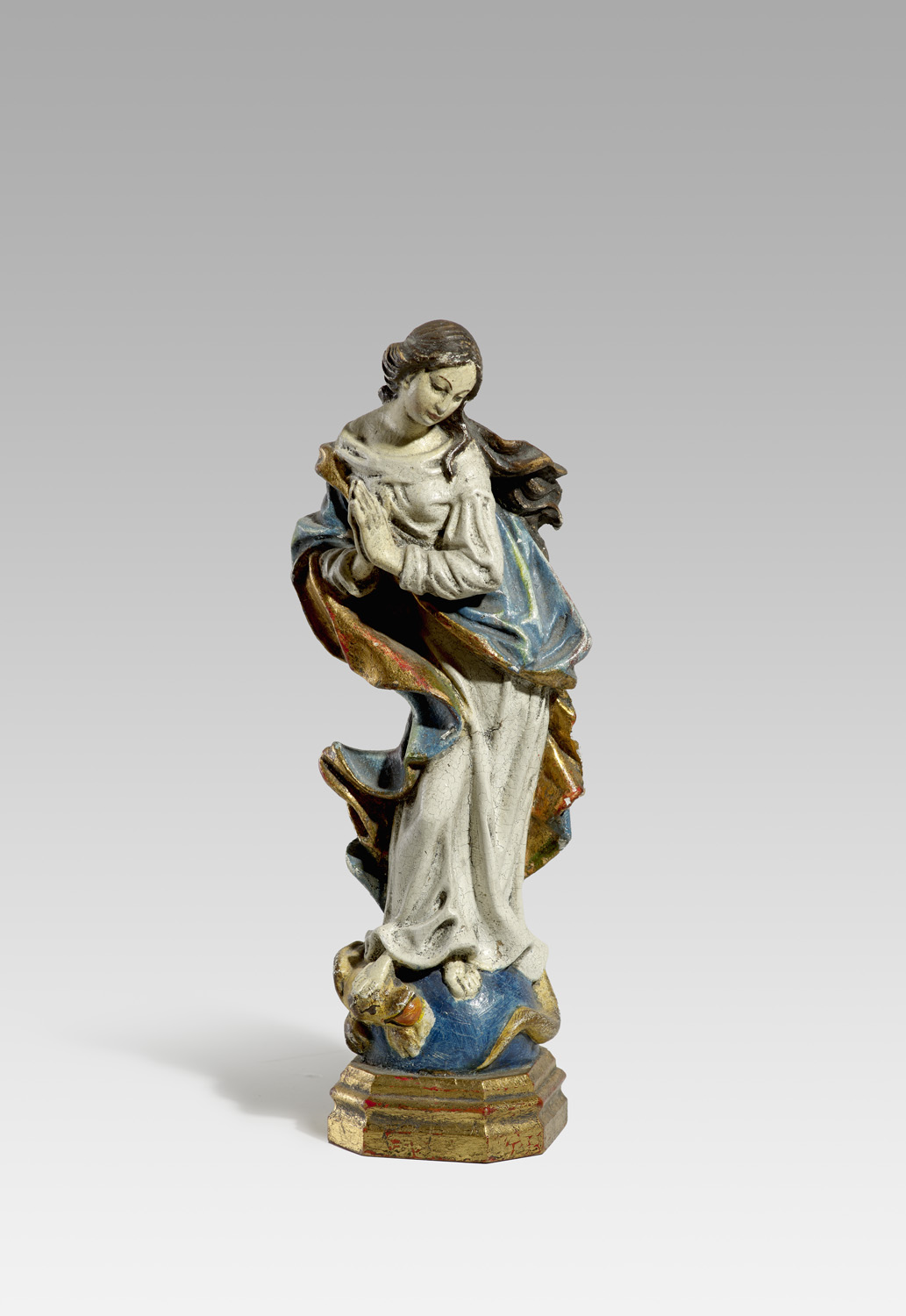 Gemälde, Zeichnungen u. Grafiken 16. bis 19. Jhd. – Privatsammlung, Berlin. - Die vorliegende Marienstatue stammt vermutlich aus dem süddeutschen Raum und folgt dem seit dem 17. Jahrhundert etablierten ikonographsichen Typus der apokalyptischen Frau: Maria steht in würdevoller Haltung betend mit gefalteten Händen auf der Weltkugel, die von einem Drachen- oder Schlangenähnlichen Wesen als Symbol für das überwundene Böse umschlungen wird. Dabei werden mit der geschwungenen Körperhaltung sowie dem bewegten Mantelwerk braocke Formtraditionen aufgegriffen und in der dekorativen Sprache der Andachtsplastik des ausgehenden 19. Jahrhunderts wiedergegeben. - Fassung partiell mit leichtem Craquelé, einige punktuelle Bereibungen und Bestoßungen. Insgesamt sehr gut.