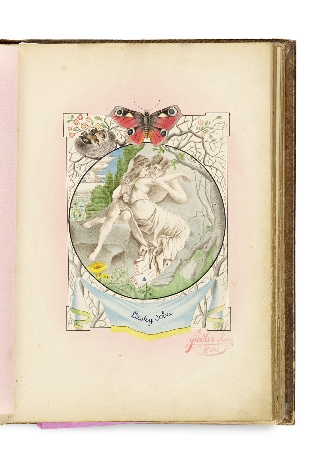 Manuskripte und Urkunden – Die Einträge, darunter Mediziner u. Juristen, u.a. von: Julius Béhal (1869-1942), Jan Fiedler, Urban Frantisek, Ottilie Fleischer, Johanna Gebhart, Franz Kollmann, Josef Novák, Eleonora Novakova, Gustav Schwarz (Med.), Karl Ullmann, Karel Vondrus, Josefine u. Anna Schürer von Waldheim, Th. Schirmer (Med.), Jan Sokolt, Václav Sperk, Josef Steinhauser (Cand. prof.), Karel Straka (stud. iur.), Maika u. Marie Ziegler etc. - Die dekorativen Federzeichnungen tls. signiert von Karel Fiedler, A. Jezek, Konhefr. u.a. - Die ersten Lagen gelockert, papierbedingt gebräunt, tls. fleckig, sonst insg wohlerhalten.